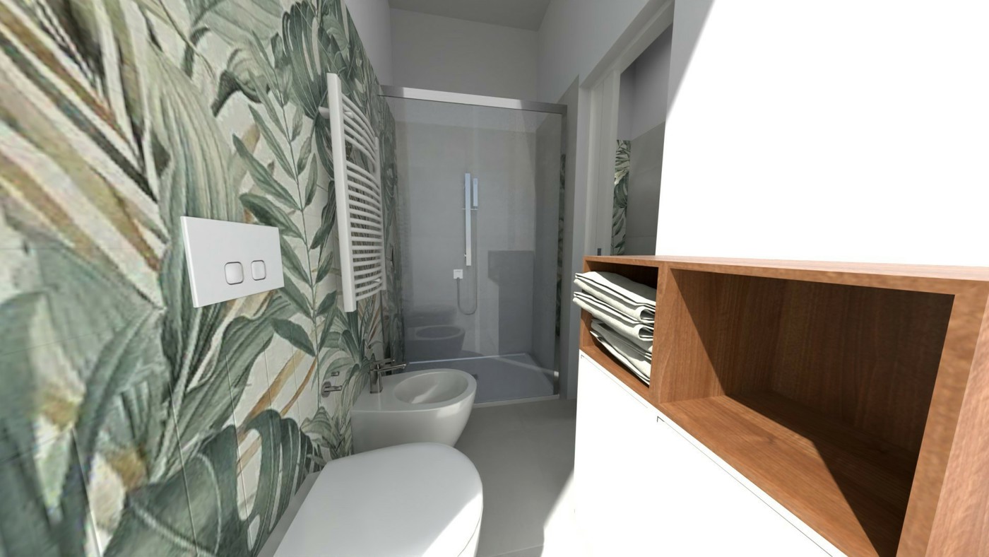 Limmobile si apre su un comodo disimpegno che conduce alla zona living open space, con angolo cottura, ripostiglio e bagno finestrato completo di antibagno.