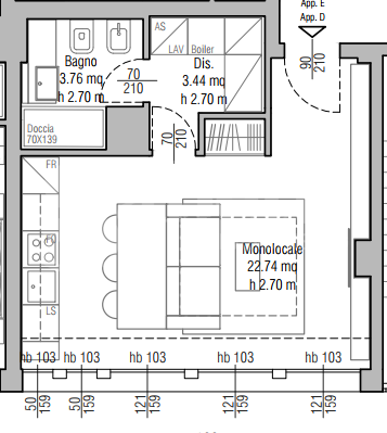 Monolocale al quarto piano composto da ingresso su zona giorno/notte con angolo cottura a vista, bagno, ripostiglio/lavanderia.