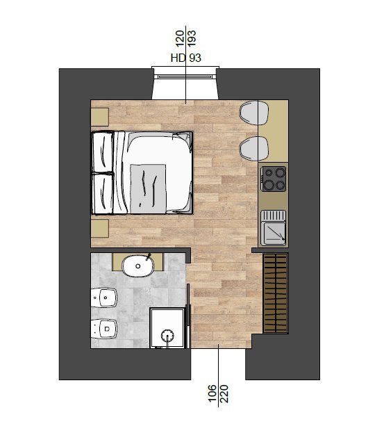 \nMonolocale completamente ristrutturato nel cuore della città. \nPosto in via Leonardo da Vinci a due passi dal centro storico della città, il che permette di raggiungere tutti i servizi e la stazione ferroviaria senza utilizzare auto o mezzi pubblici.