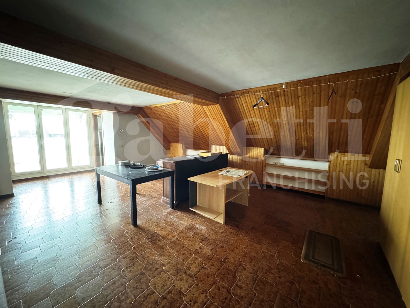 L'ingresso apre su un vasto e luminoso ambiente living, valorizzato da soffitti con travi in legno a vista e perlinatura che donano un carattere rustico e unico.