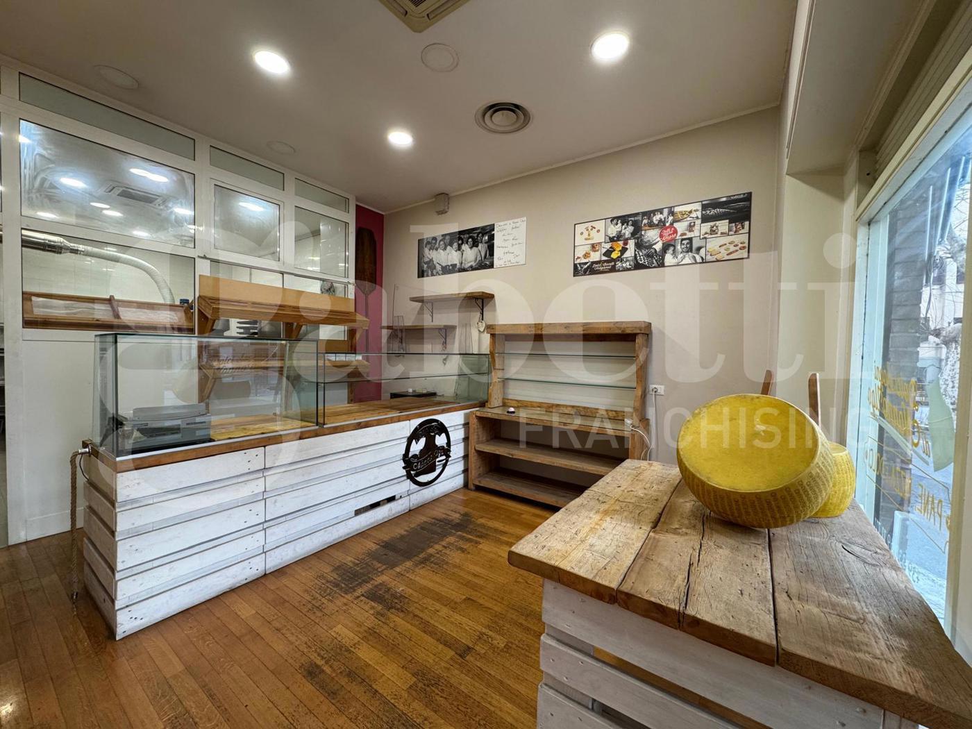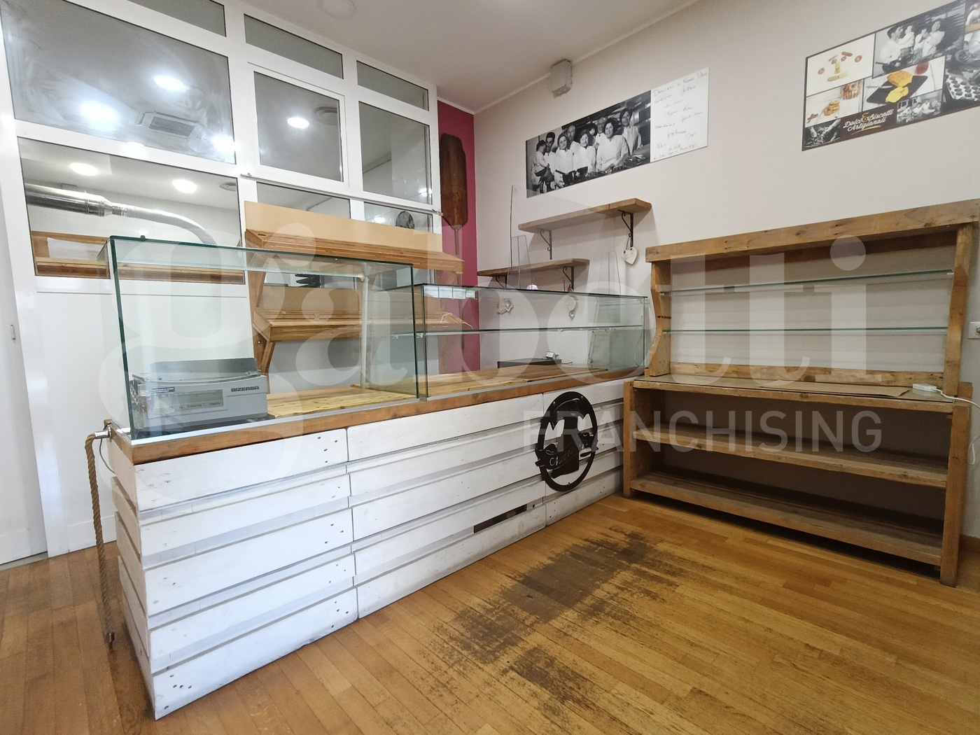 All'interno ancora presente parte degli arredi e dei macchinari di seguito riportati: mobile con pensile sovrastante, lavabo, bancone in acciaio, rastrelliera con teglie forno, frigorifero e planetaria.