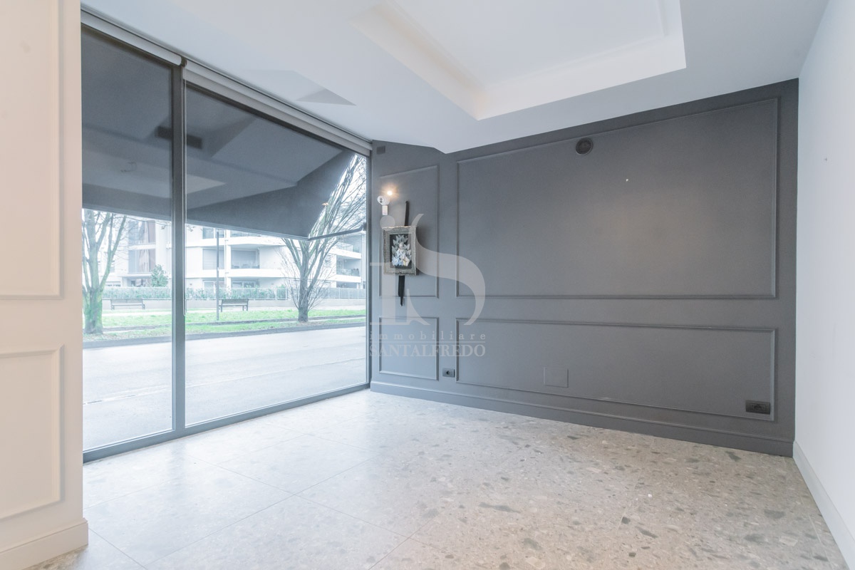 . Pavimentazione continua in lastre effetto ceppo lombardo, resistente, durevole e coerente con un uso commerciale . Pareti rifinite con boiserie e pannellature decorative, integrate nei pilastri e nelle superfici verticali, che conferiscono ritmo e ordine allo spazio . Controsoffitto architettonico con gole per illuminazione indiretta e integrazione ordinata degli impianti . Vetrate continue a tutta altezza fronte strada, che garantiscono elevata luminosità naturale e forte visibilità . Serramenti in profilo scuro, dal disegno contemporaneo e pulito . Servizio igienico rifinito con rivestimenti effetto pietra, top coordinato, lavabo integrato e sanitari sospesi Ogni ambiente, inclusi i servizi, è trattato con lo stesso livello qualitativo.