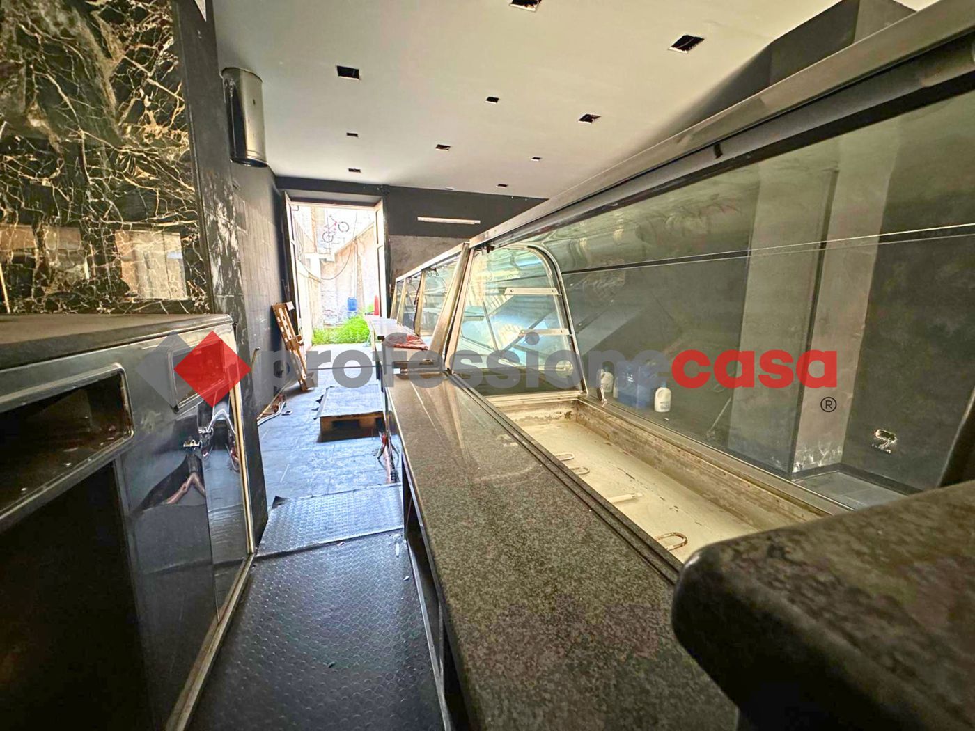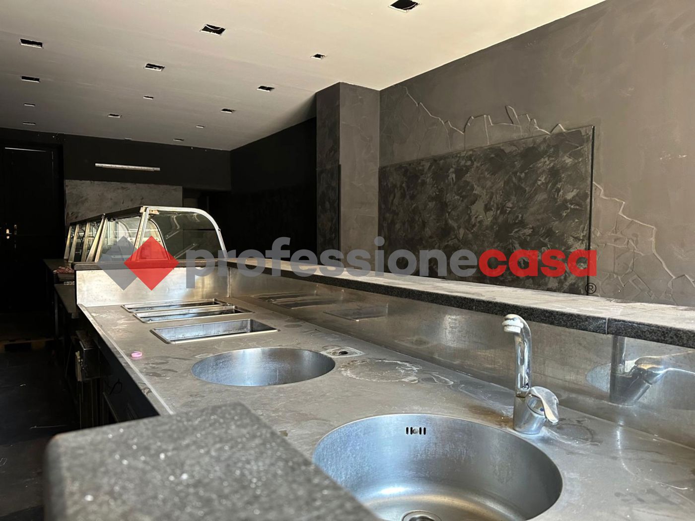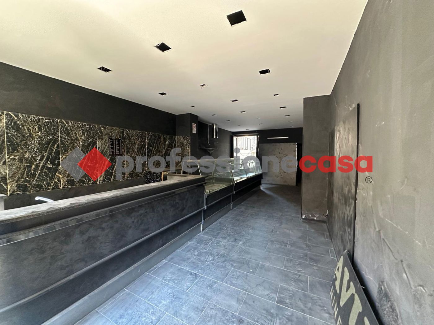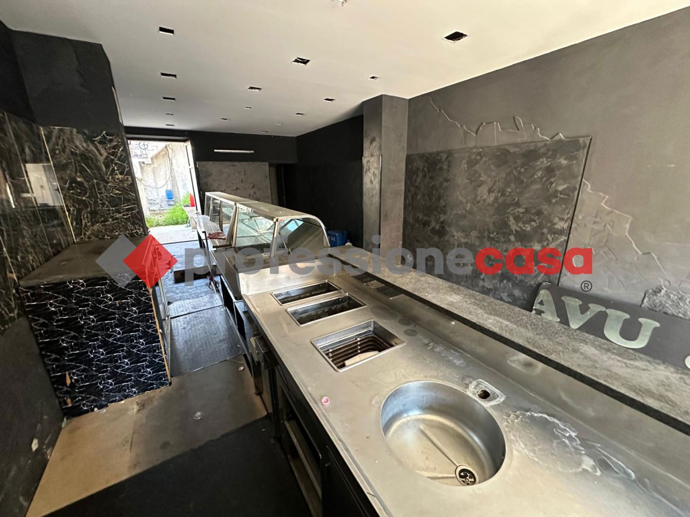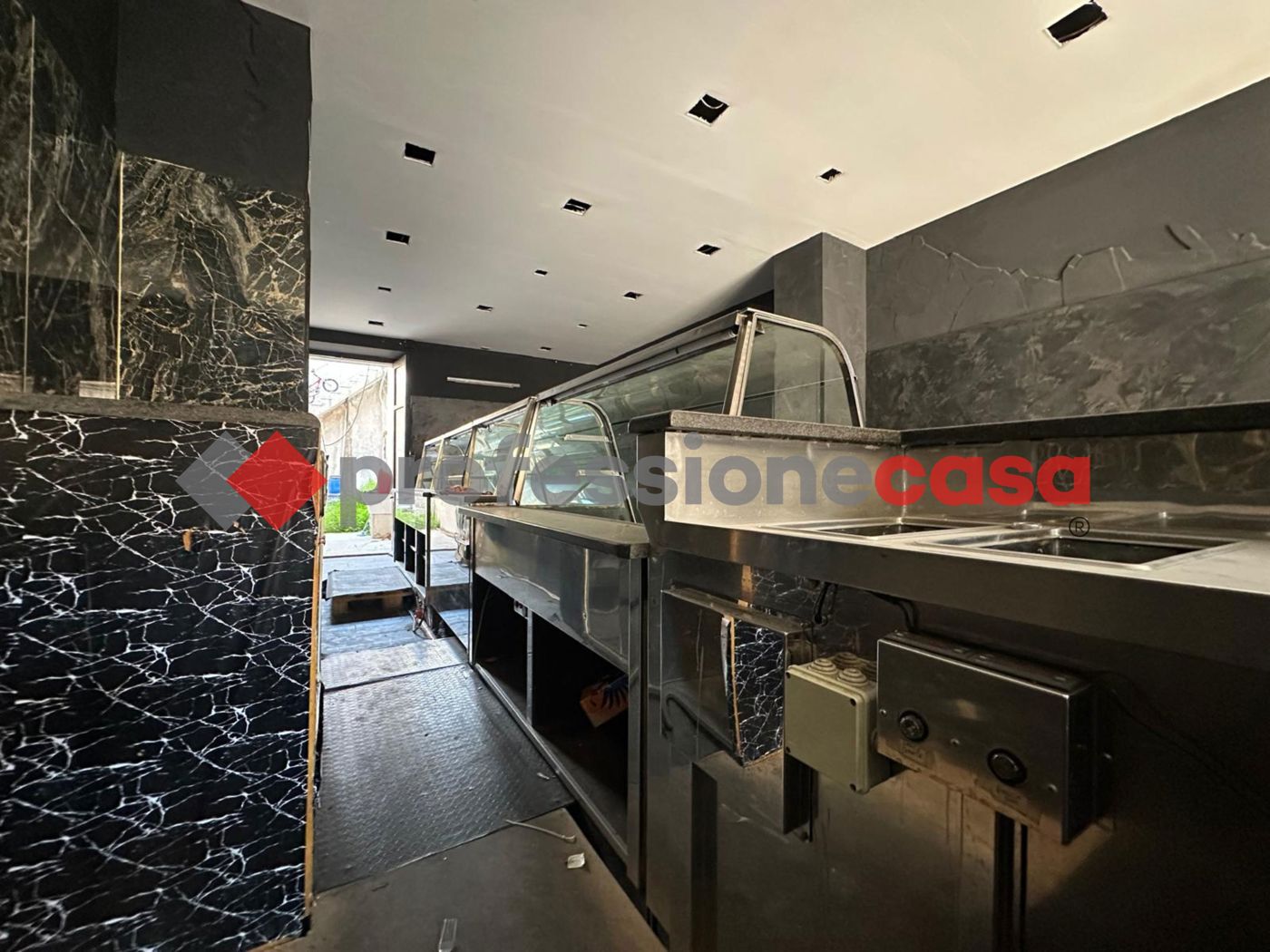 Allinterno gi presente un ampio bancone per alimenti e canna fumaria, rendendo la soluzione particolarmente adatta per attivit di ristorazione, gastronomia o street food. Limmobile stato parzialmente rimodernato con controsoffitto in cartongesso e faretti.