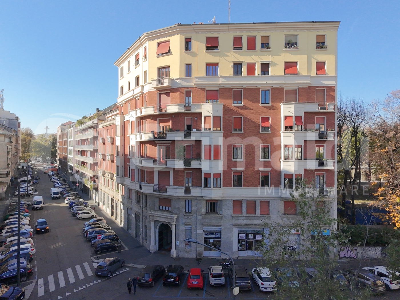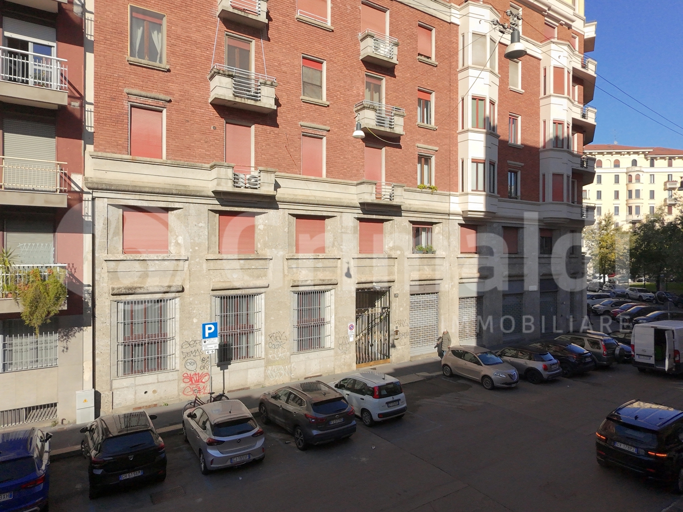 Milano zona Acquabella/Citt Studi : Prospiciente alla piazza Guardi ad angolo con via Giovanni da Milano sorge un palazzo residenziale con lessico tardo-eclettico/razionalista tipico del primo 30 caratterizzato da paramenti in laterizio e cornici/basamento in pietra, forte trattamento del cantonale con bovindi e balconi sovrapposti che disegnano un motivo geometrico continuo; piano terreno a grandi bucature per negozi/ingresso monumentale.