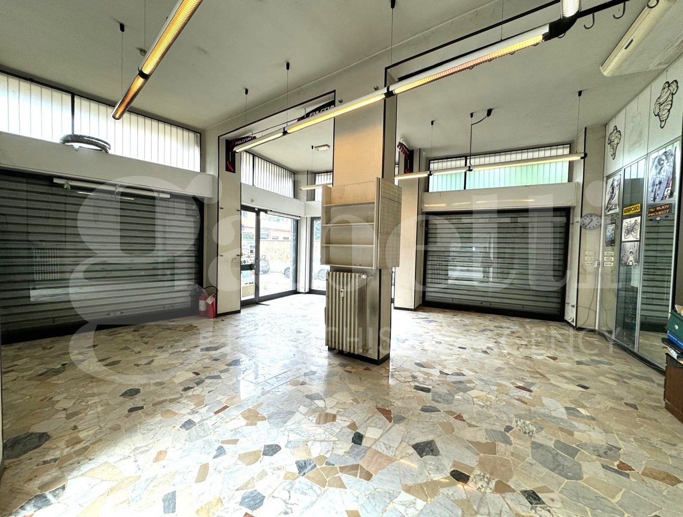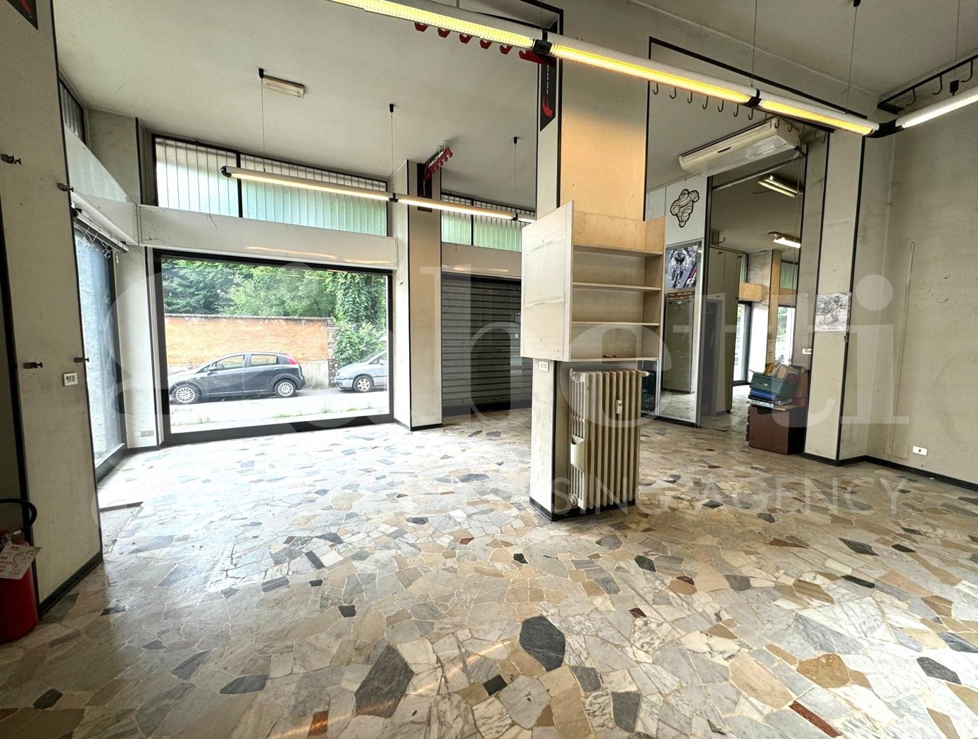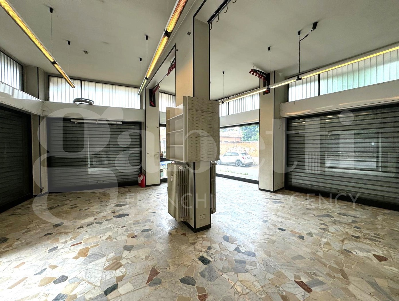 ampio negozio open space di 95 mq, situato a 800 metri dal centro storico, con tripla esposizione angolare con nove vetrine, con soffitto alto 4 metri.
