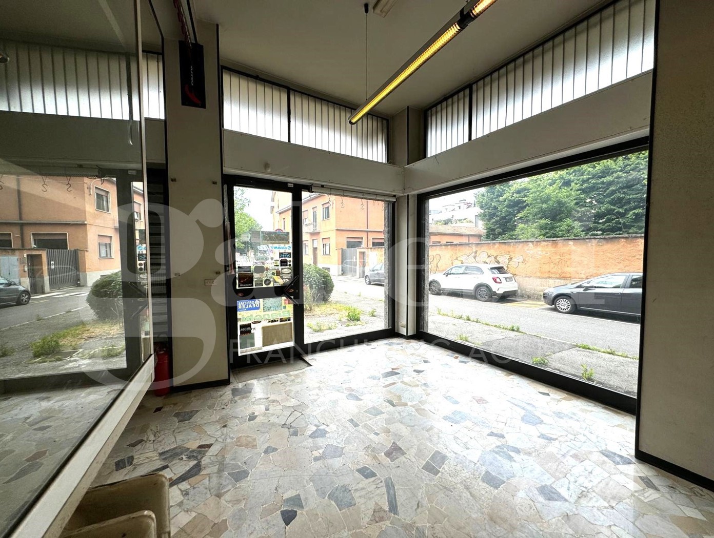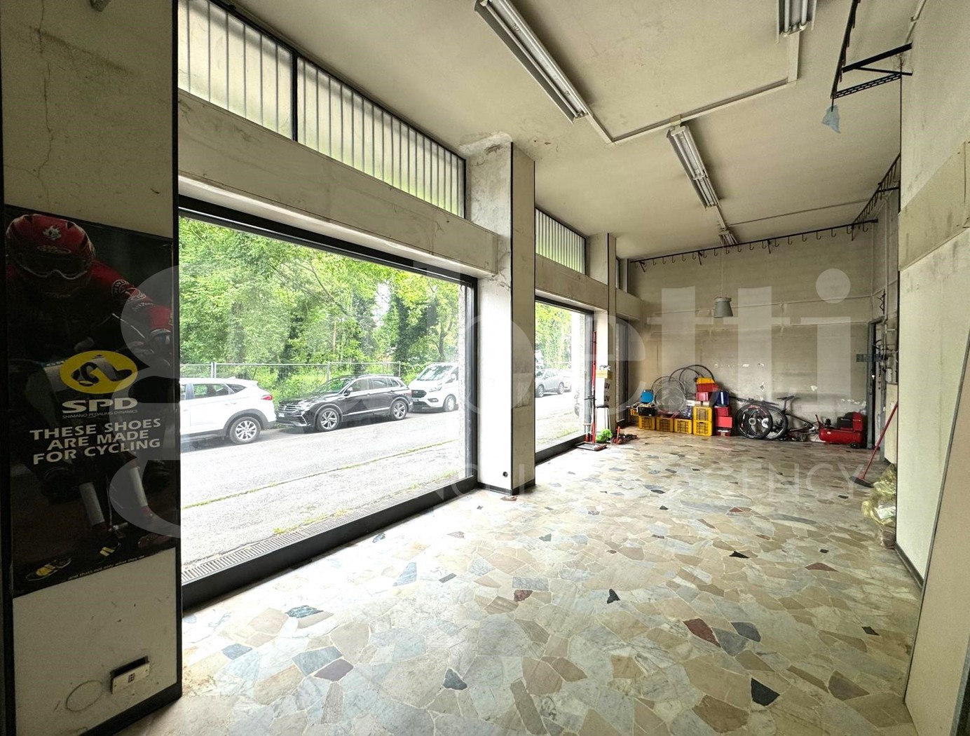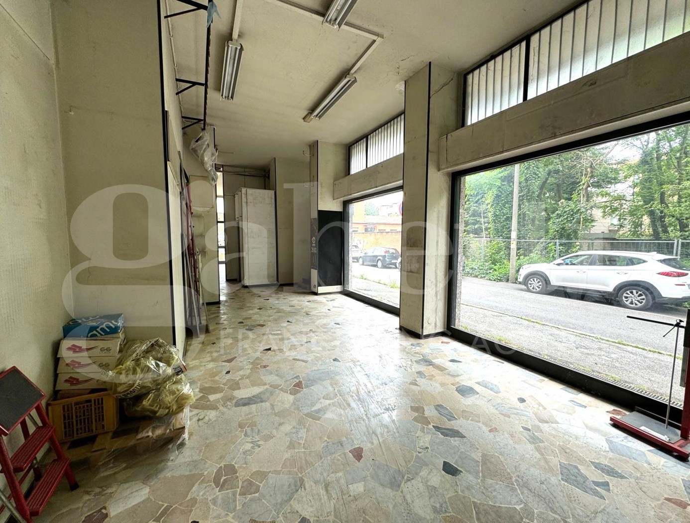 ampio negozio open space di 95 mq, situato a 800 metri dal centro storico, con tripla esposizione angolare con nove vetrine, con soffitto alto 4 metri.