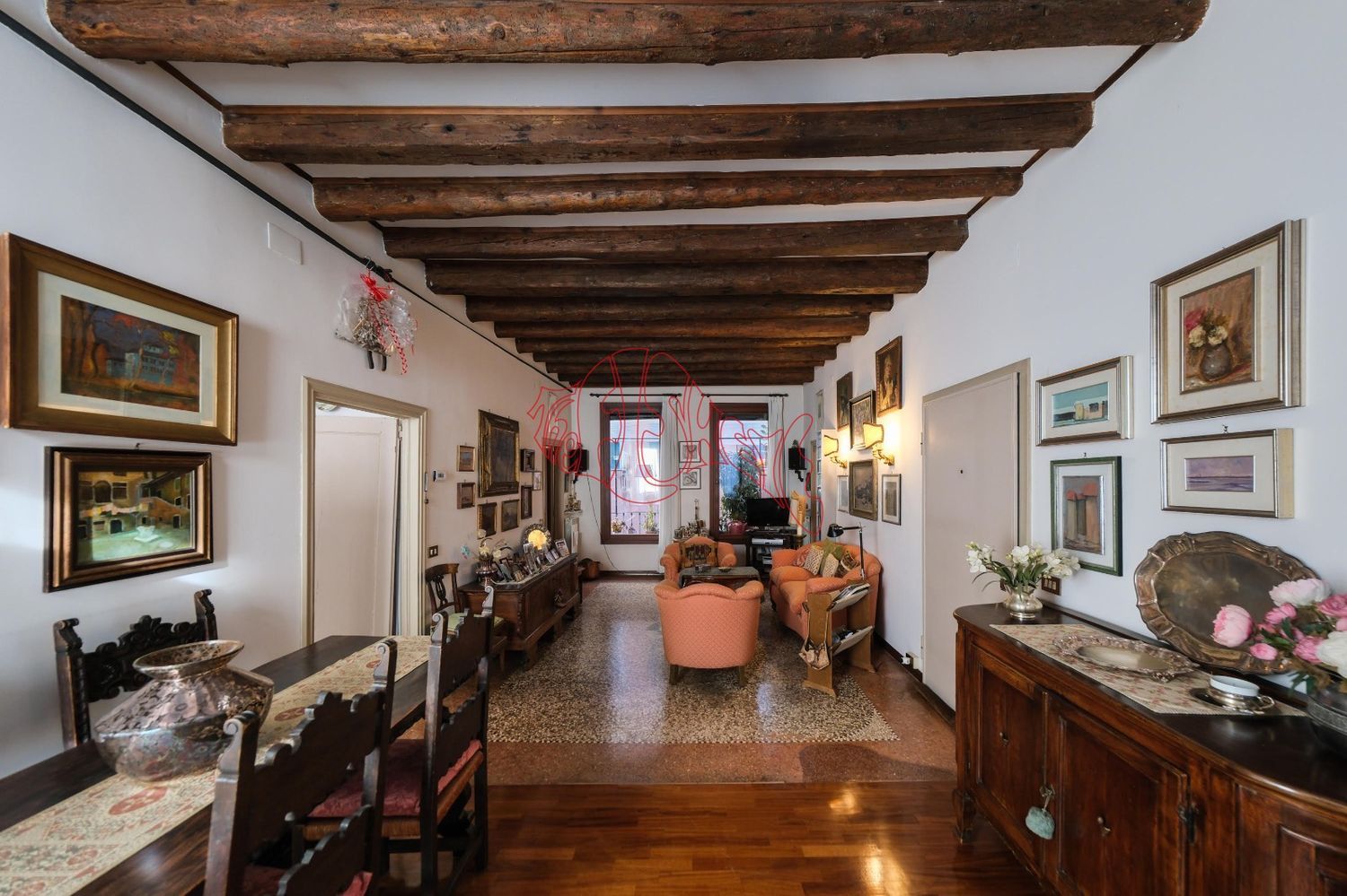 Appartamento in contesto di sole tre unità abitative, molto ben tenuto e rifinito, con tipica pianta veneziana, pavimenti in terrazzo e travi a vista.