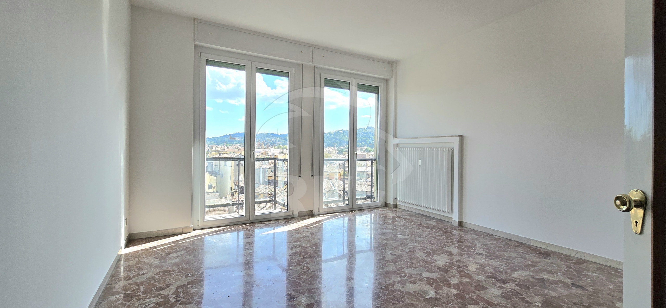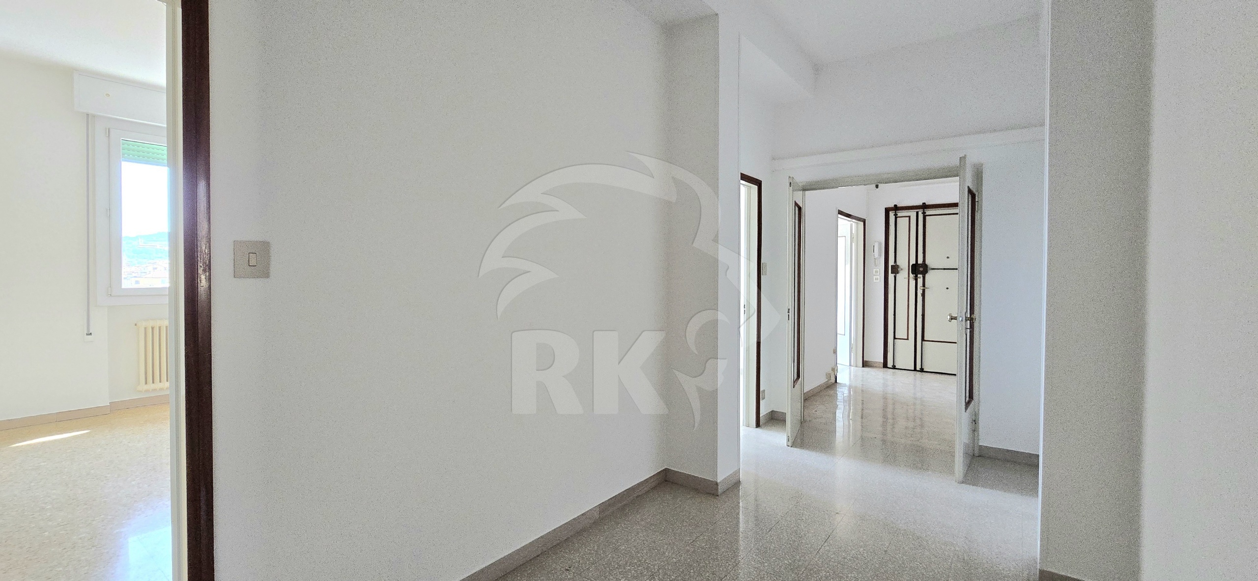 L'ampio disimpegno prosegue anche nella zona notte, dove si trovano due camere matrimoniali sempre con vista sulla città. L'appartamento dispone di un bagno principale e di un'utilissima lavanderia separata, completa di lavandino e WC. Due balconi permettono di sfruttare appieno la posizione elevata, offrendo un affaccio privilegiato.