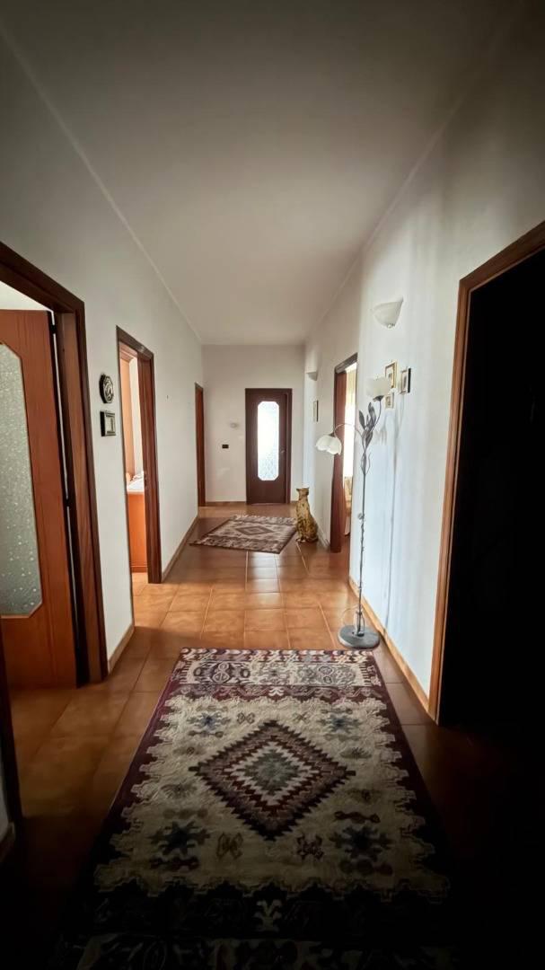 Un corridoio ben distribuito separa la zona giorno dalle tre camere da letto, dal bagno principale e da un secondo balcone di servizio.