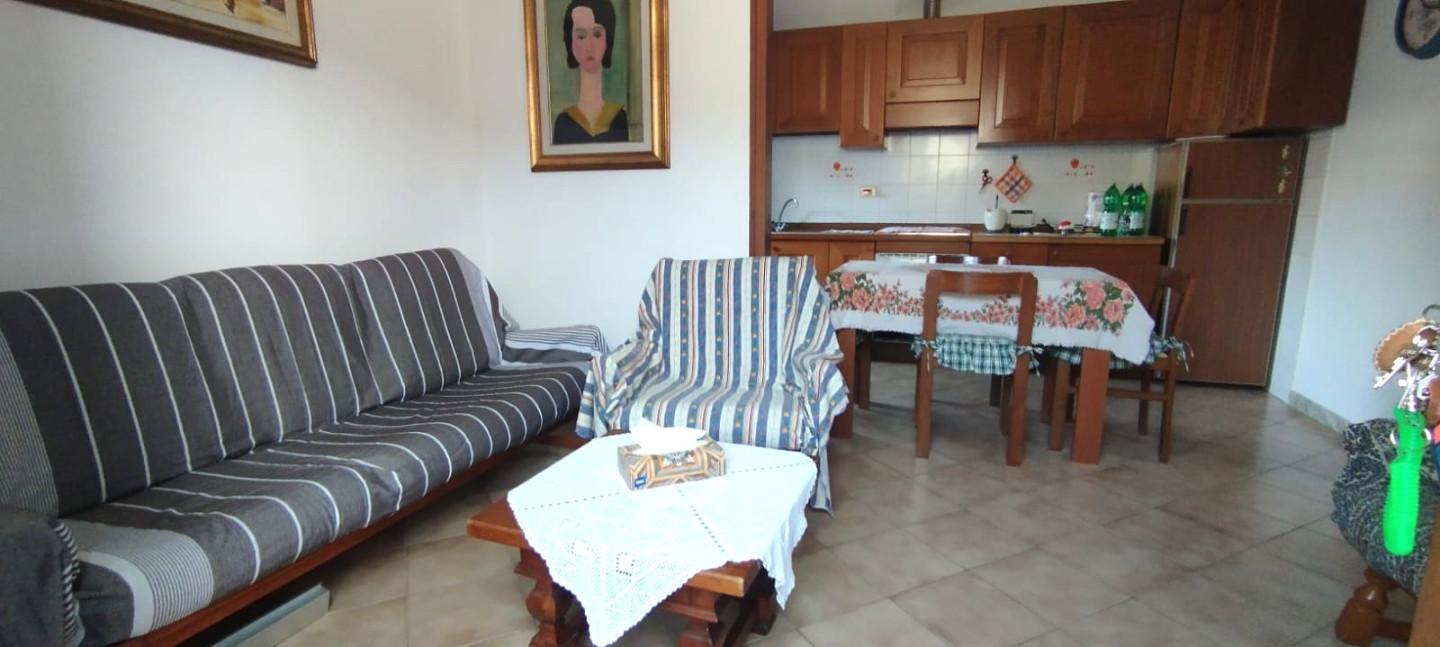 L'interno, luminoso e ben distribuito, comprende un ampio soggiorno con cucina a vista, ideale per trascorrere momenti di relax o cene in compagnia.