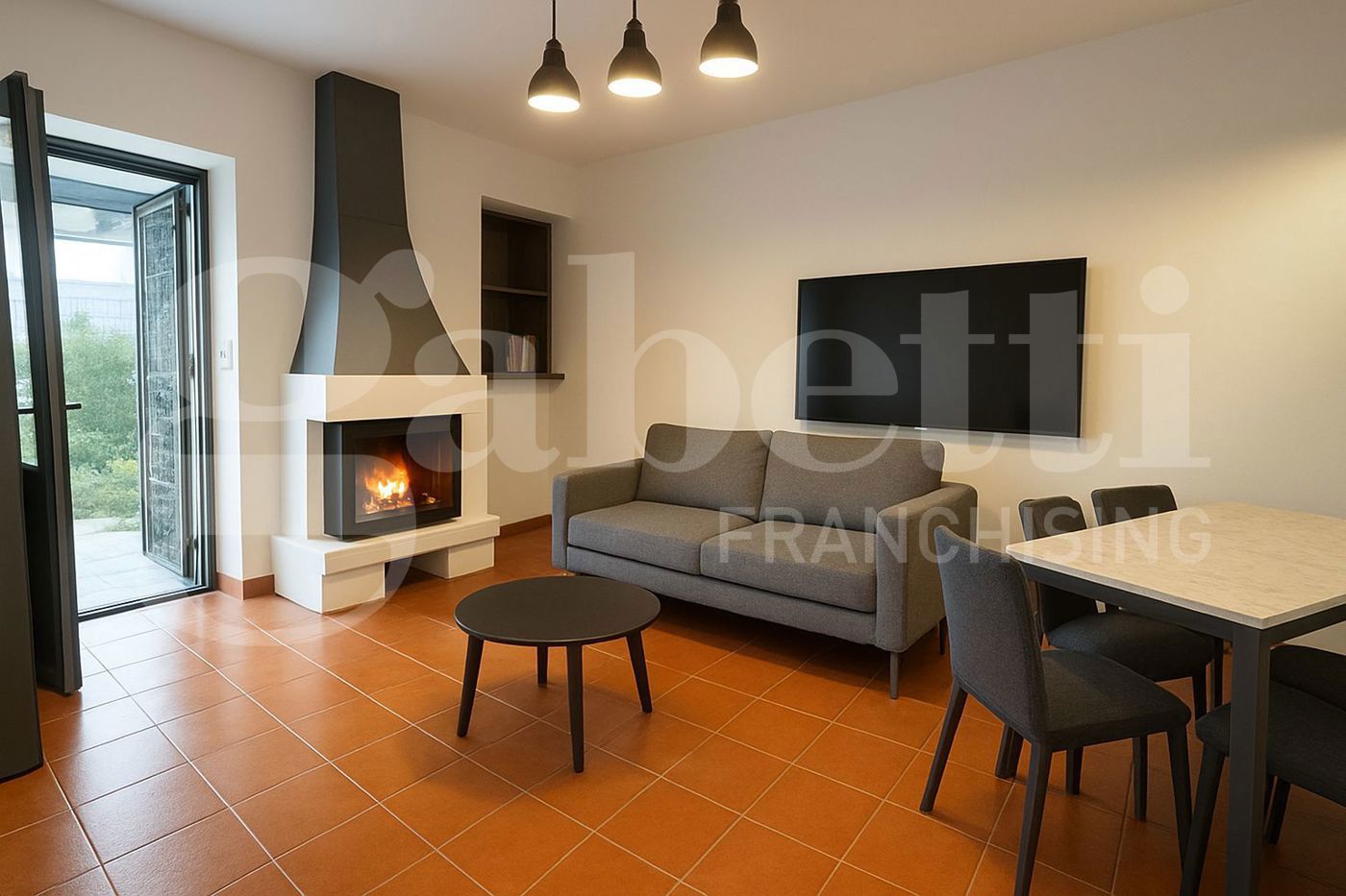 Il soggiorno arricchito da un suggestivo camino che crea un'atmosfera calda e familiare e con accesso a un giardino privato di circa 45 mq, perfetto per trascorrere momenti di relax immerso nella natura.