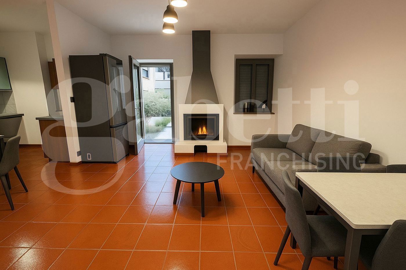 Il soggiorno arricchito da un suggestivo camino che crea un'atmosfera calda e familiare e con accesso a un giardino privato di circa 45 mq, perfetto per trascorrere momenti di relax immerso nella natura.