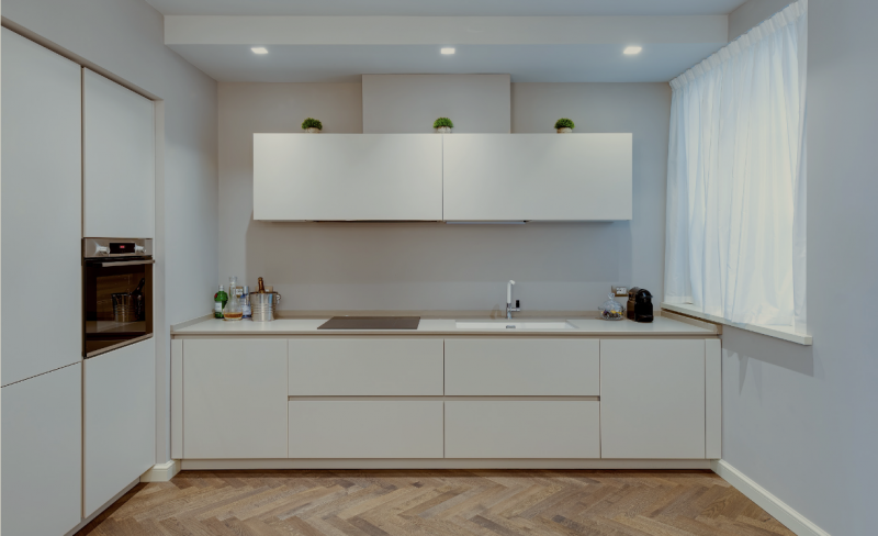 La cucina, separata ma perfettamente collegata alla zona living, è funzionale e ben organizzata, con piano di lavoro e zona operativa completa.