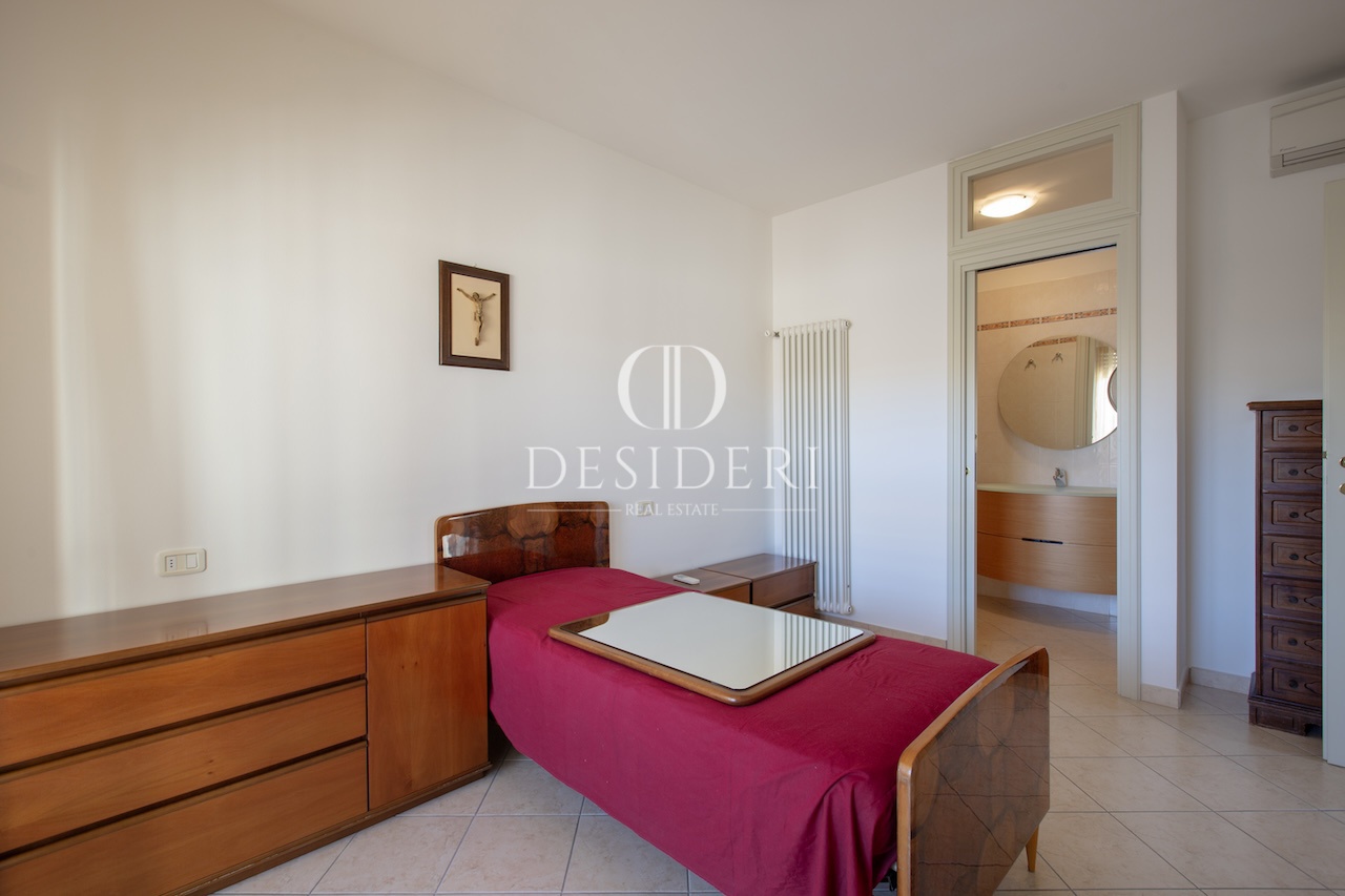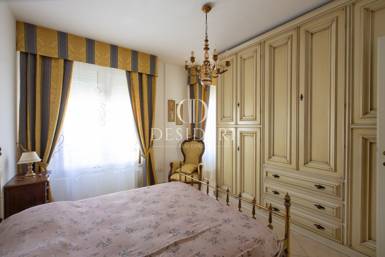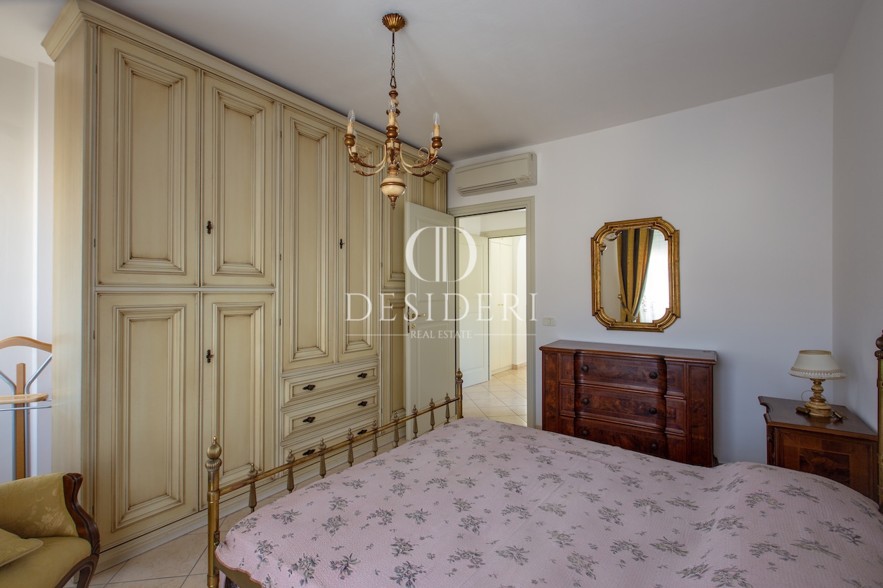 L'appartamento, arredato con mobili di pregio, è composto da soggiorno con zona sofà, zona pranzo e accesso a un balcone di servizio, una cucina abitabile con comodo ampio ripostiglio utilizzato come lavanderia, una camera matrimoniale, una camera singola e due bagni, uno dei quali con finestra.