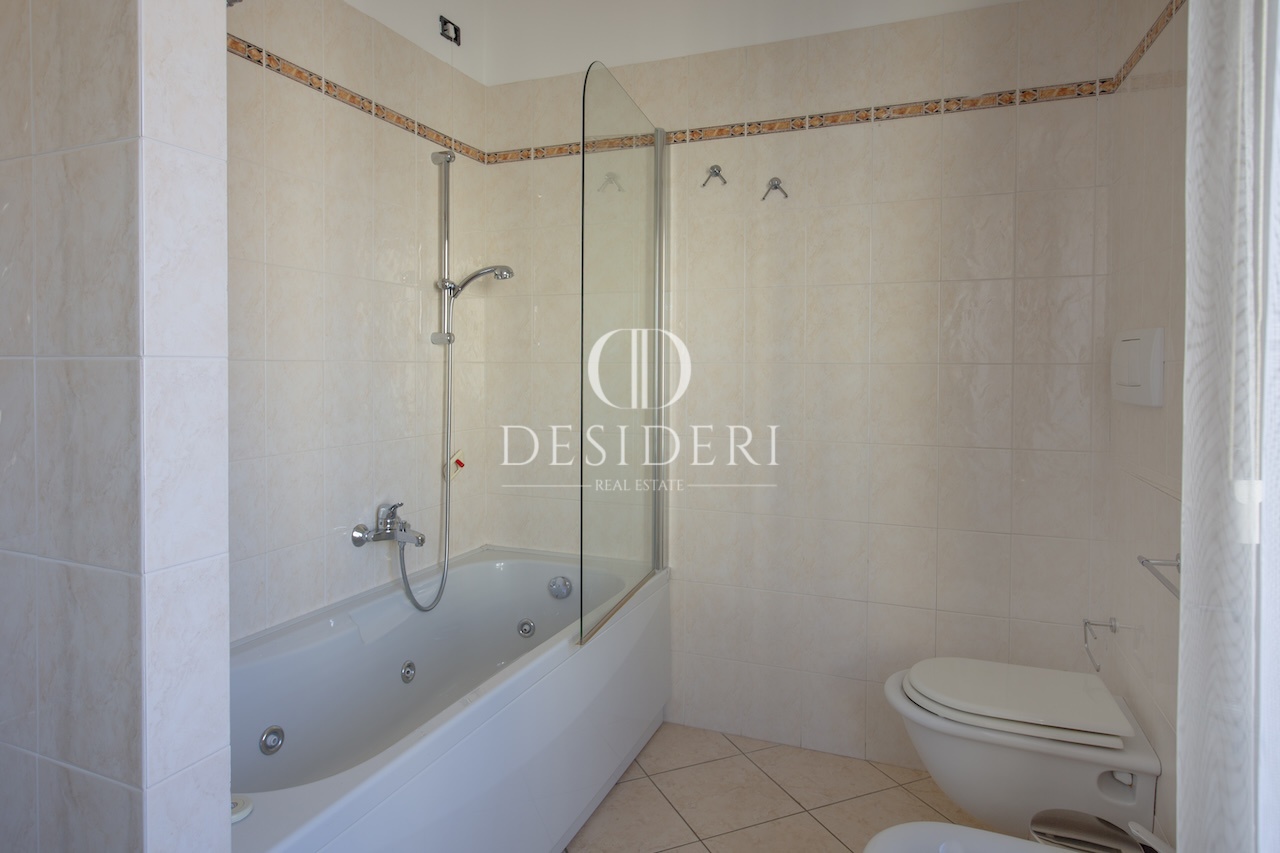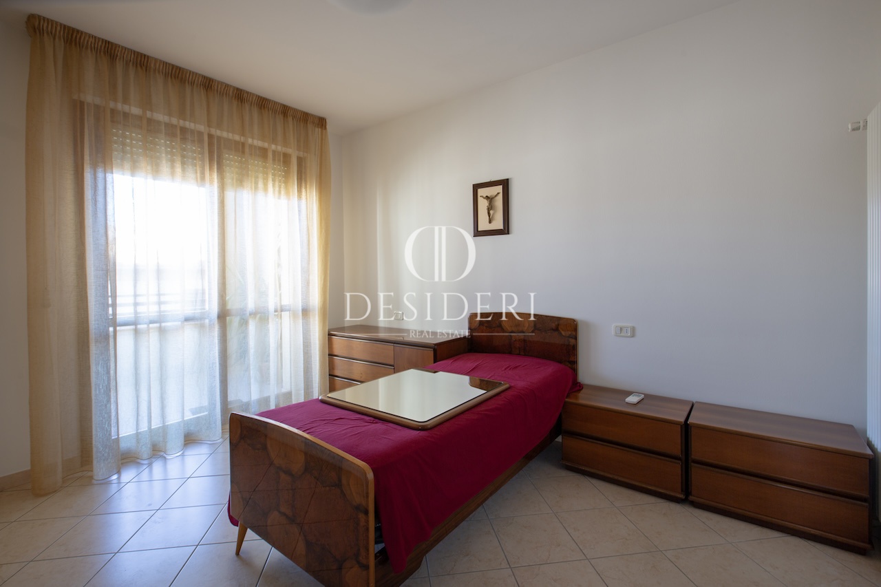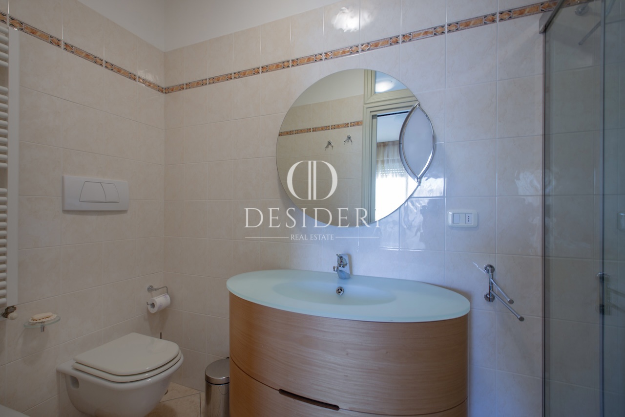 L'appartamento, arredato con mobili di pregio, è composto da soggiorno con zona sofà, zona pranzo e accesso a un balcone di servizio, una cucina abitabile con comodo ampio ripostiglio utilizzato come lavanderia, una camera matrimoniale, una camera singola e due bagni, uno dei quali con finestra.