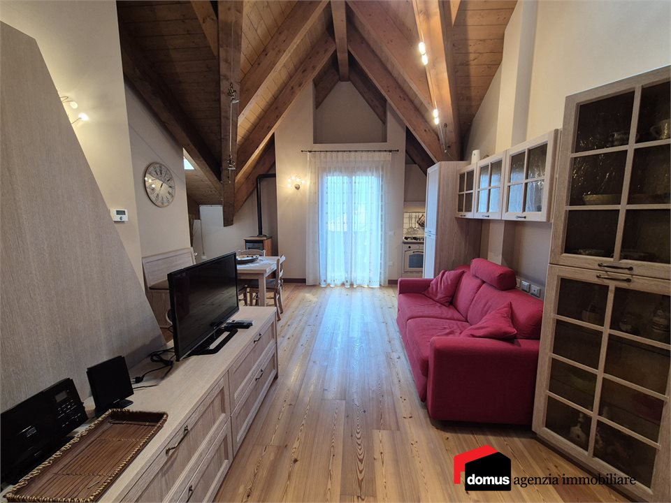 Questa splendida unità immobiliare, in privilegiata posizione d'angolo, è situata all'ultimo piano di una tranquilla e recente residenza, presenta pavimenti in legno (rovere), soffitti travati a vista e arredi tipici da montagna conservati pari al nuovo.