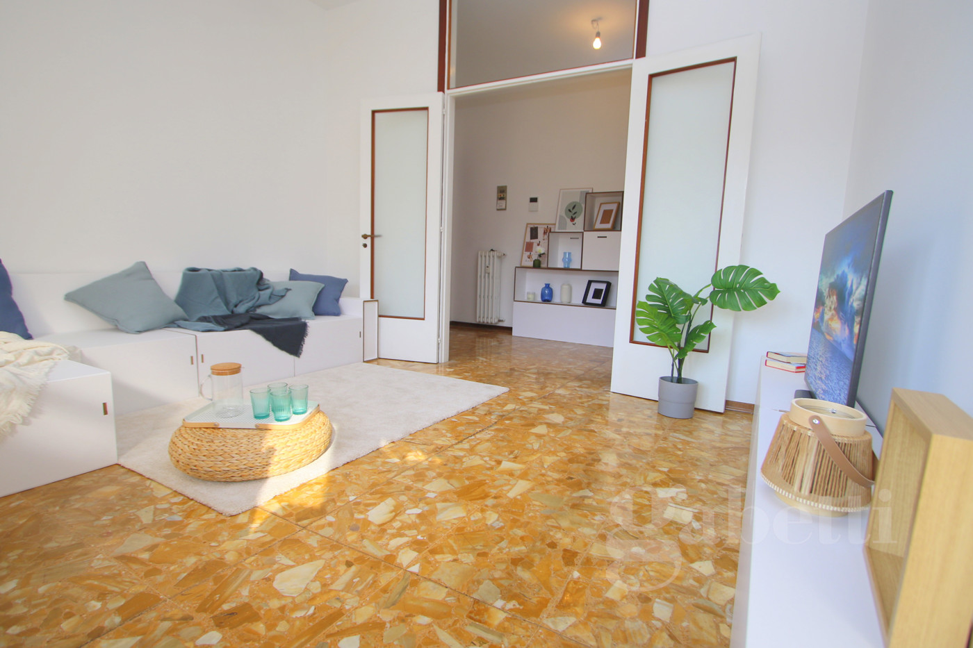 L'ingresso sull'ampio disimpegno, sul quale si affacciano tutti gli spazi della casa; la zona giorno comprende l'ampio soggiorno, che ospita comodamente sia una zona TV/relax che una zona pranzo e la cucina separata ed abitabile.