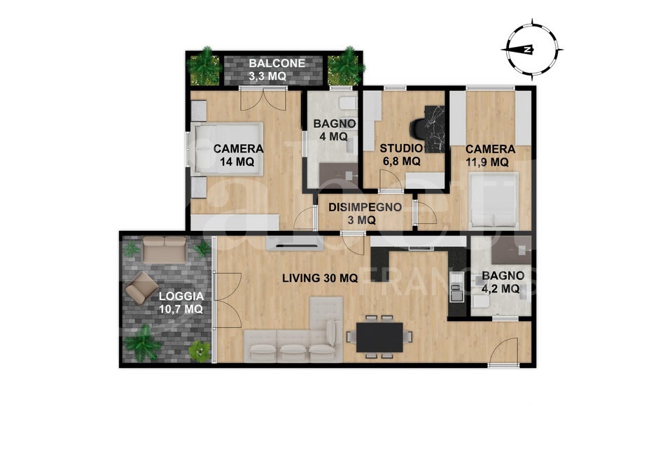 Esempio unit 3 Piano Primo - SLV 104 mq Ingresso su ampio living con parete vetrata da cui si accede alla loggia di 13 mq, ripostiglio/lavanderia, disimpegno notte, camera matrimoniale con bagno e balcone, camera doppia e studio.