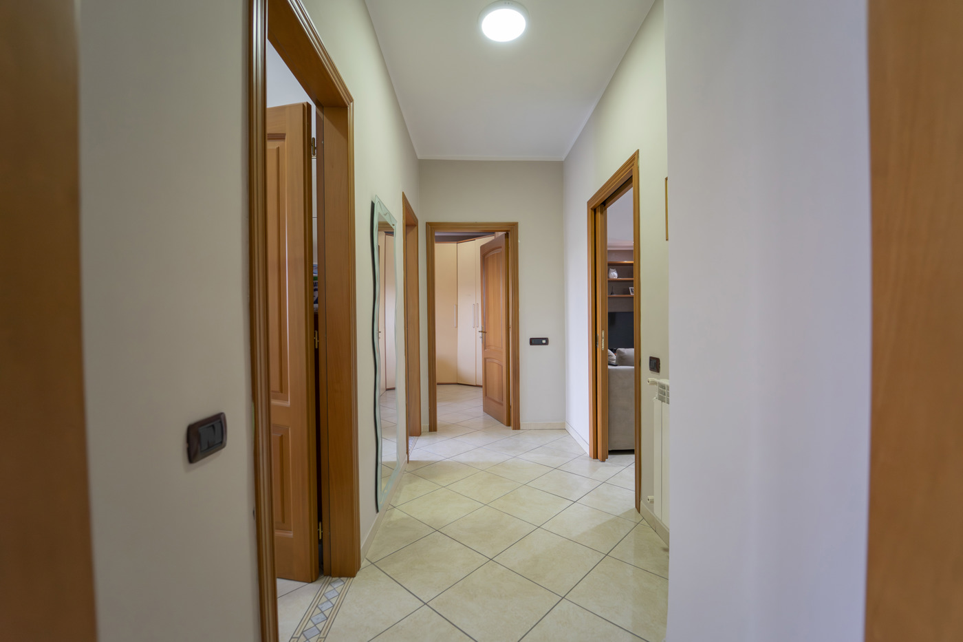 Il disimpegno conduce alla zona notte, dove troviamo due camere ben proporzionate e due bagni, entrambi completi e ben rifiniti.