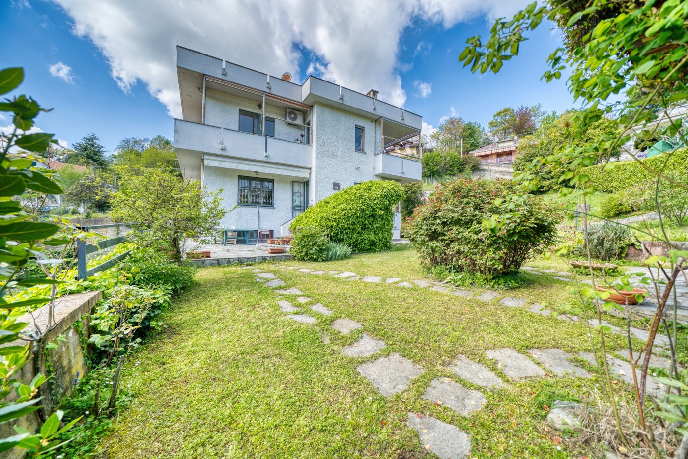 In Villa bifamiliare elegante e luminoso appartamento con accesso indipendente, libero 4 lati e posto su due livelli, circondato da balconi e terrazzi.