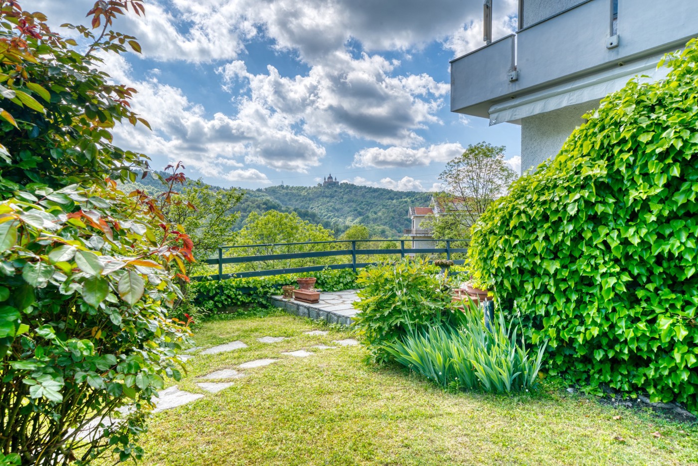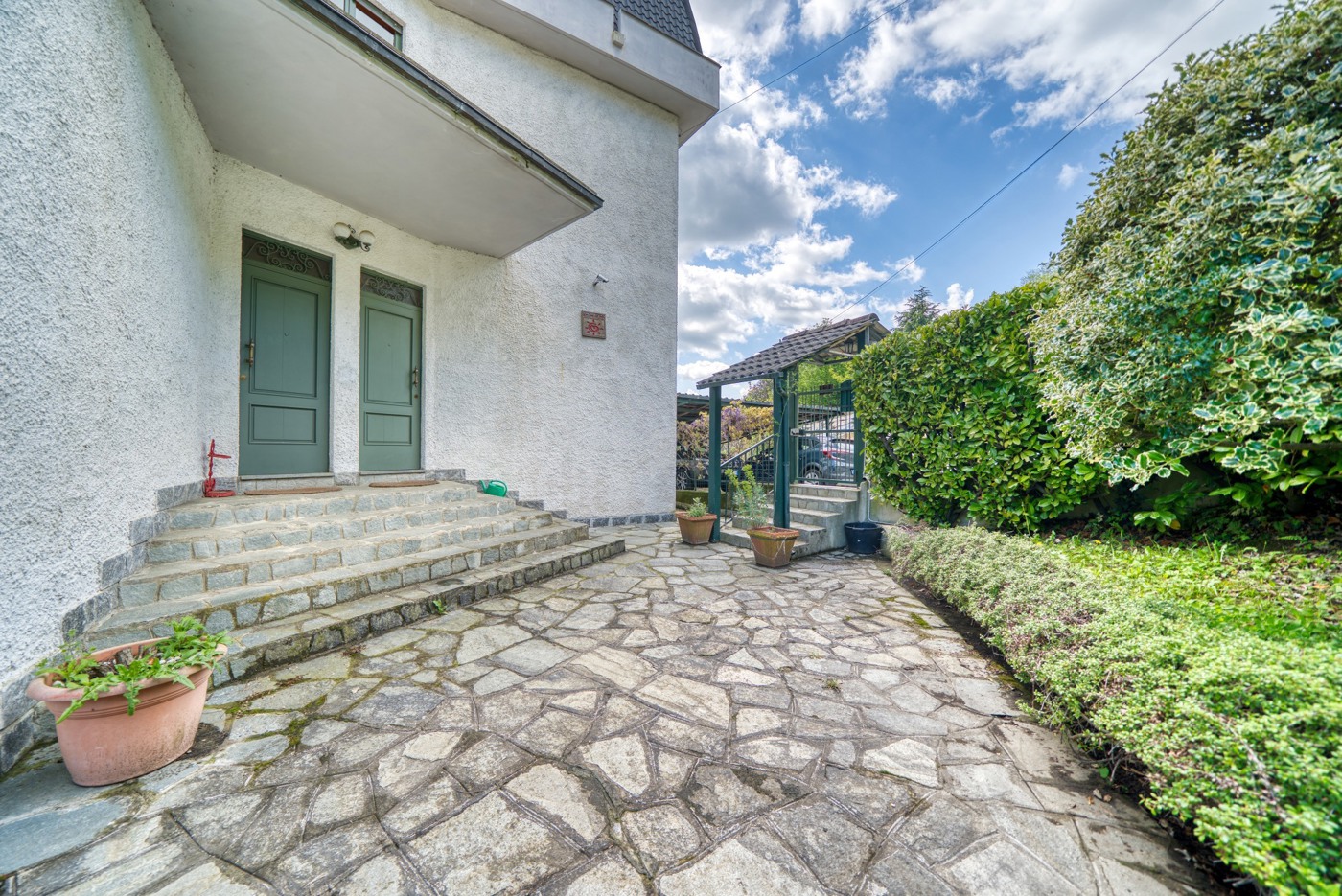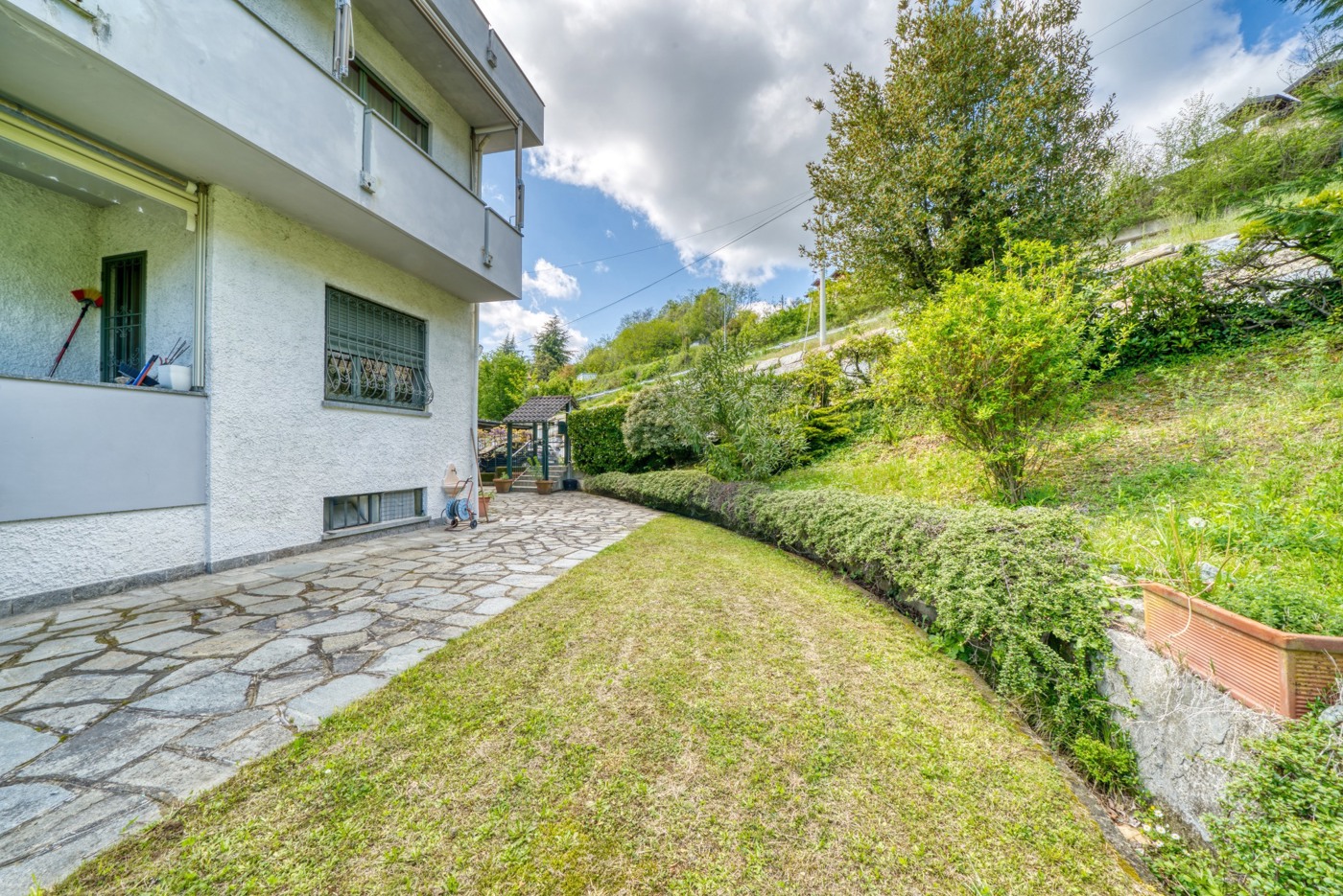 Il grande giardino comune, curato e ben piantumato, diviso a zone, con una piccola area a parcheggio, una zona a prato pianeggiante, due zone lastricate per pranzi all'aperto di cui una con grande barbecue/forno, ed infine un'altra area pianeggiante con accesso carraio in cui vi un basso fabbricato finestratissimo di circa 50 mq per feste o attivit varie.
