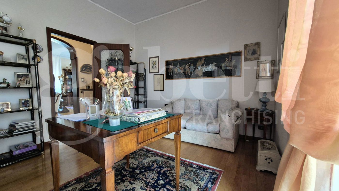 Lampio ingresso conduce sulla destra al salone doppio, servito da camino e balconata con affaccio interno, mentre sulla sinistra troviamo uno spazioso studio, utilizzabile anche come camera da letto.