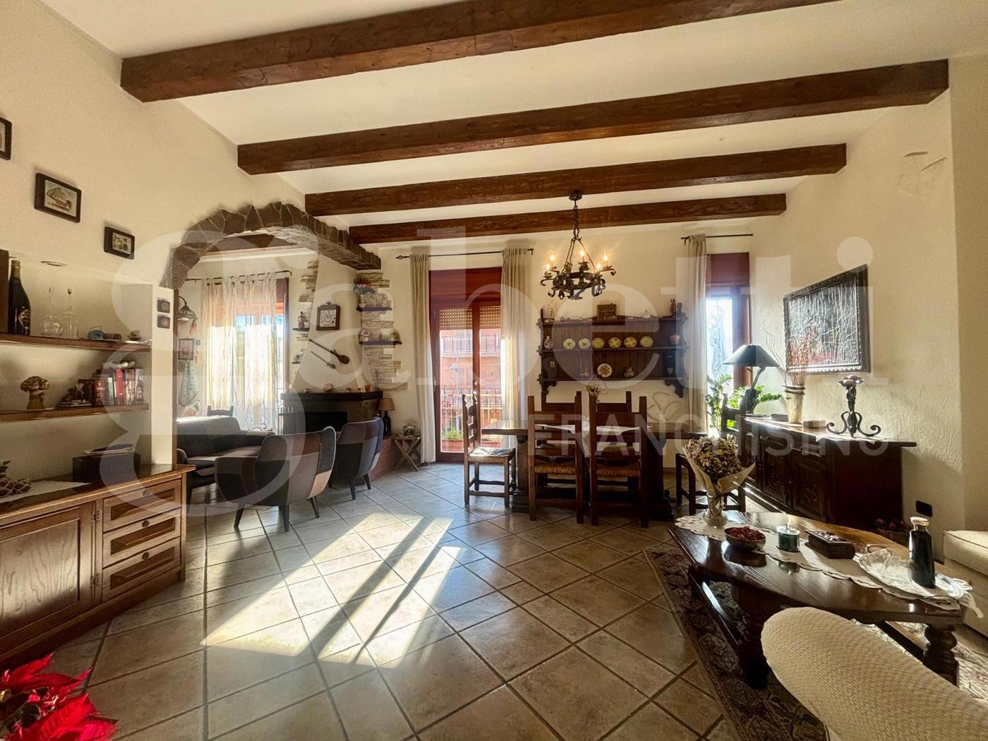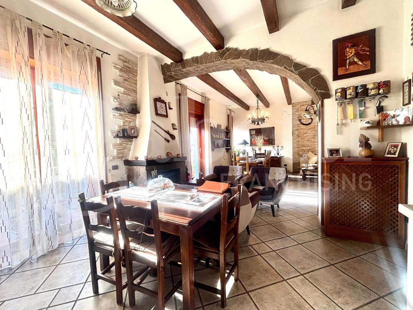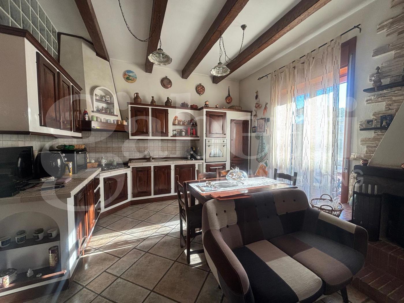 Limmobile composto da ingresso ampio e luminoso che conduce a un grande salone con cucina open space, arricchito da camino funzionante, stile rustico e cucina in muratura a vista.