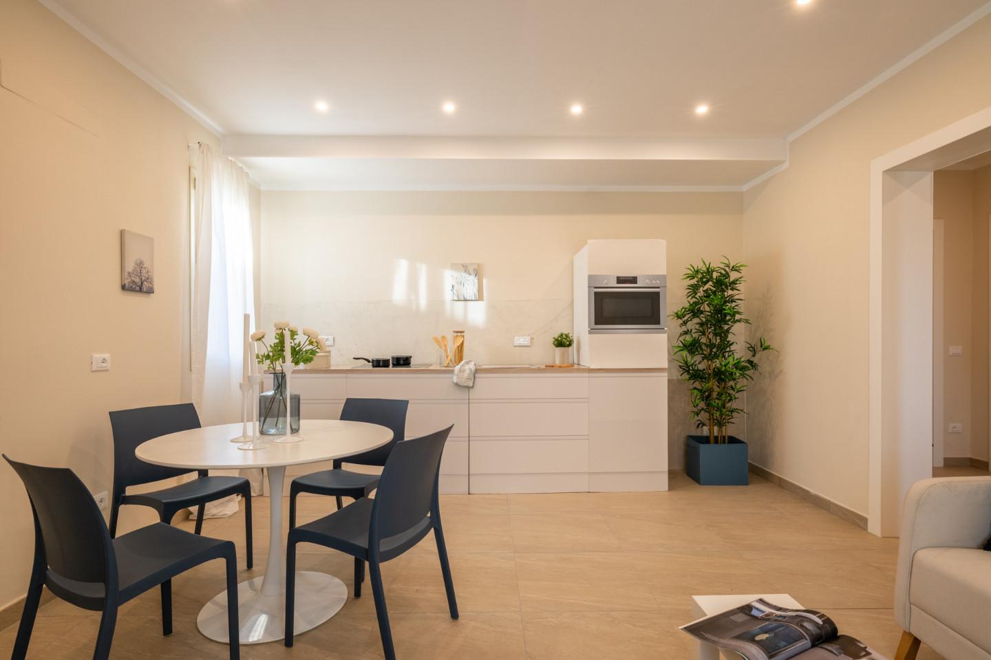 Gli spazi di questo appartamento sono molto versatili, infatti è possibile ricavare una terza camera matrimoniale unendo il soggiorno ed angolo cottura in un unico vano. SPAZIO ESTERNO Lo spazio esterno permette di parcheggiare 2 auto all'interno della proprietà, poter installare una casina in legno ma allo stesso tempo permette di poter essere vissuto per momenti di relax.