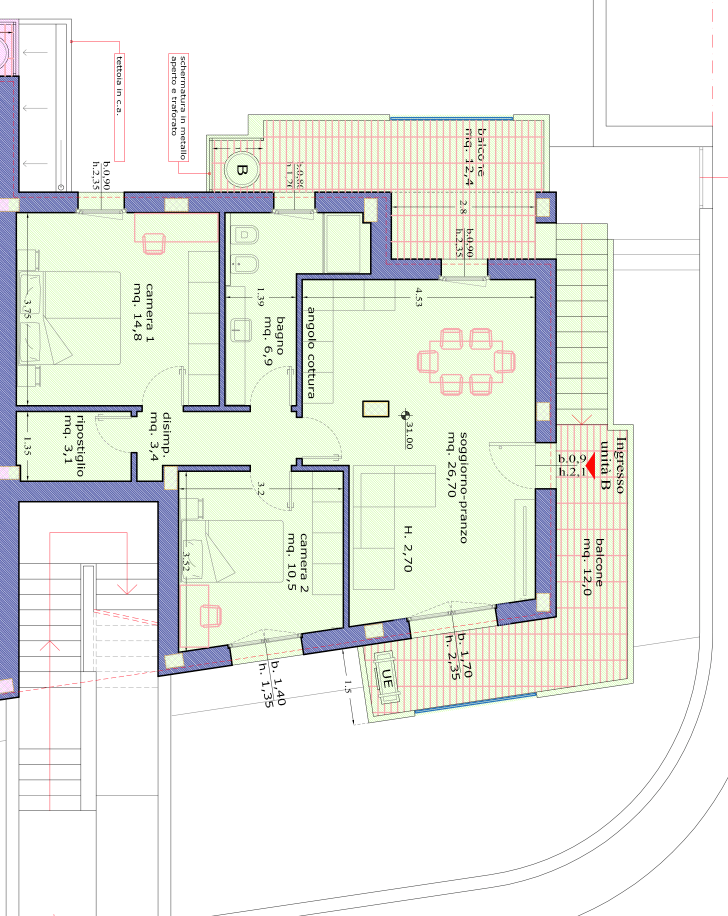 Ingresso indipendente, libero su 3 lati e cosi disposto: Al piano terra rialzato: - Due balconi abitabili (8,6 mq e 6,5 mq) e scala esterna di ingresso, disposti su 3 lati dellappartamento - Living Open space di circa 30 mq - Bagno 1 finestrato con doccia - Bagno 2 con doccia e aspiratore - Camera 1 di circa 14,4 mq - Camera 2 di circa 12,1 mq - Ripostiglio Al piano terra: Giardino/resede di circa 110 mq Posti auto per circa 40 mq Prezzo al mq commerciale: circa Euro 3.680 + IVA Prezzo richiesto: Euro 368.000 + IVA "APPARTAMENTO B": Circa 66 mq calpestabili, circa 93 mq commerciali.