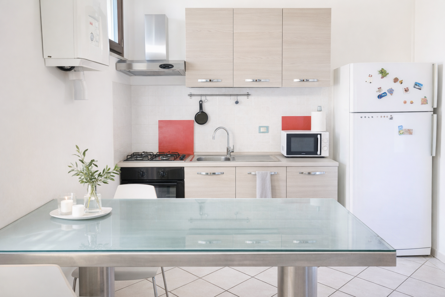 Lasciata l'auto sul posto auto esclusivo si attraversa il resede e si entra direttamente nel soggiorno; attraversatolo troviamo la cucina abitabile il cui arredo rimane nell'appartamento.