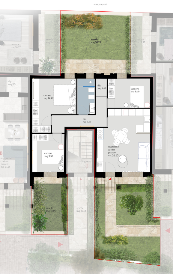 Ingresso indipendente attraverso giardino privato, ampio soggiorno con angolo cottura adatto a cene conviviali e relax/TV, ripostiglio/lavanderia, camera matrimoniale, camera doppia, bagno.