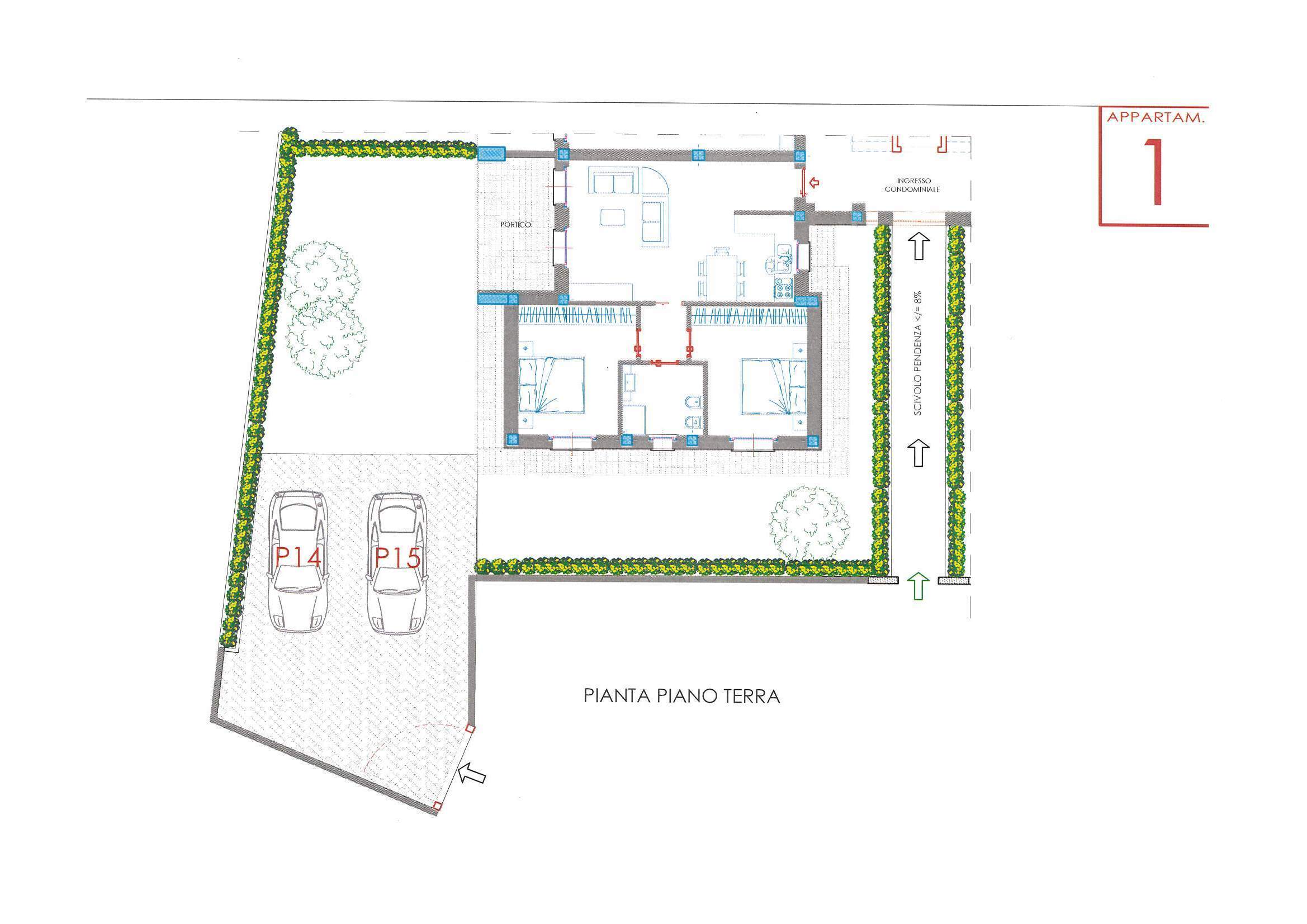 In nuovo complesso residenziale vicino ai servizi proponiamo appartamento ad ingresso anche indipendente in piccolo complesso, al piano terra, alloggio 1: ingresso in ampio soggiorno con angolo cottura con accesso a portico e giardino, disimpegno, due camere matrimoniali con accesso a giardino, bagno.