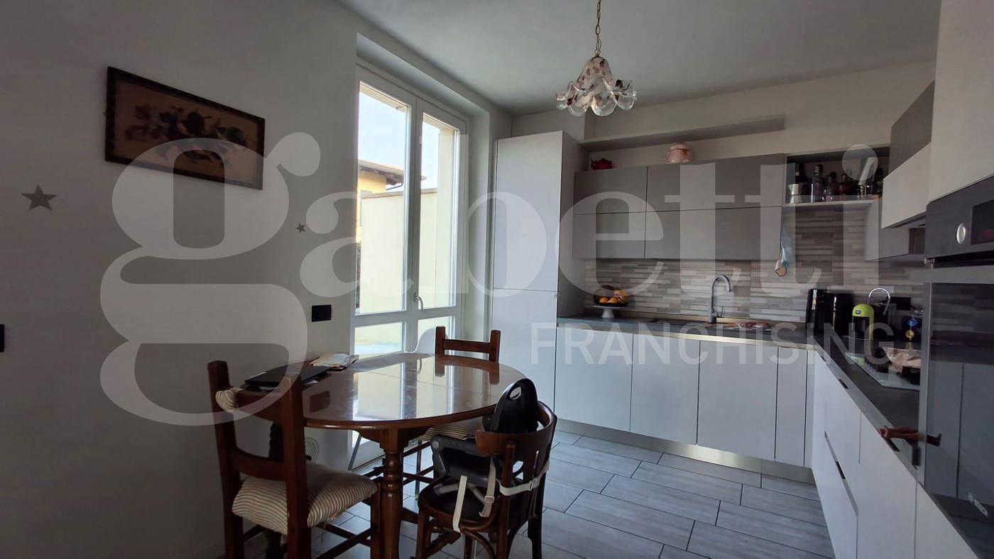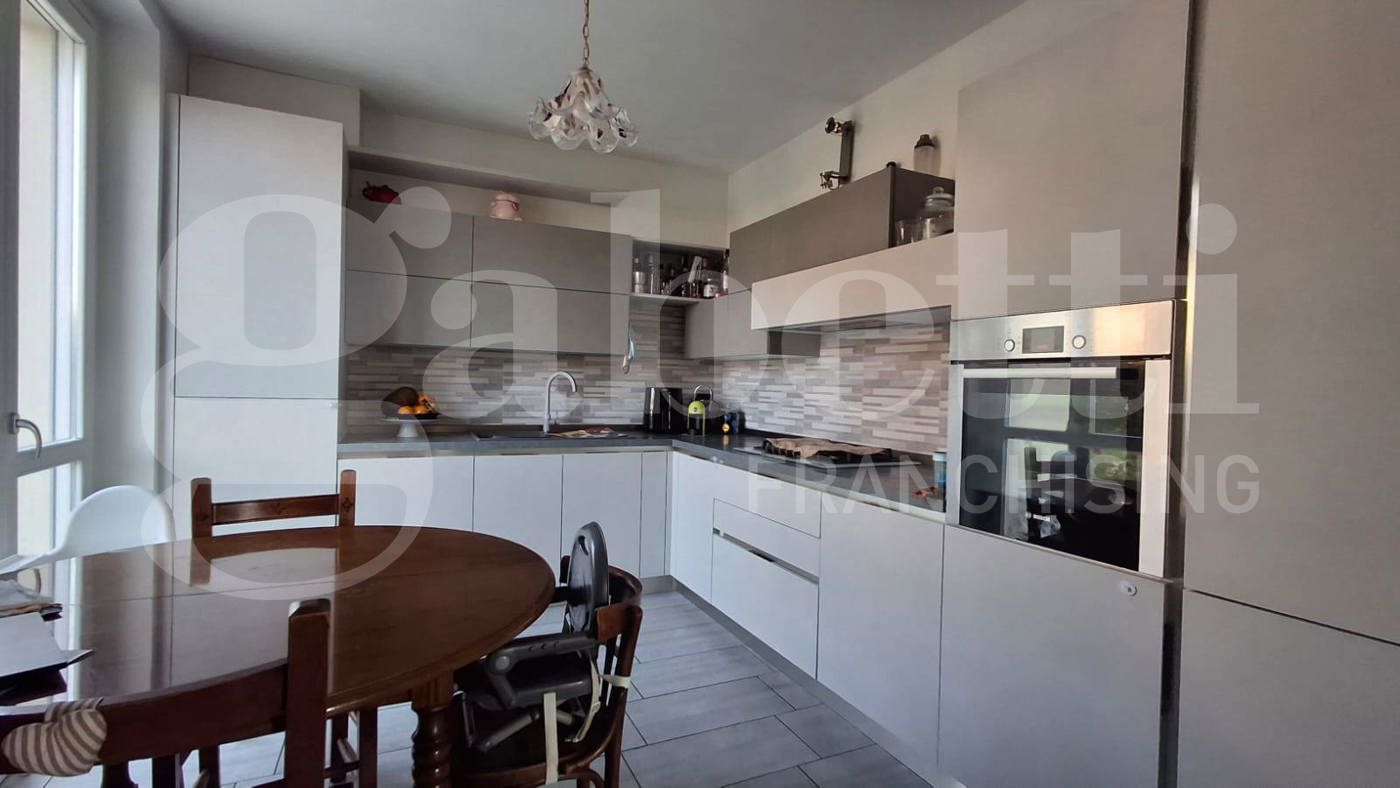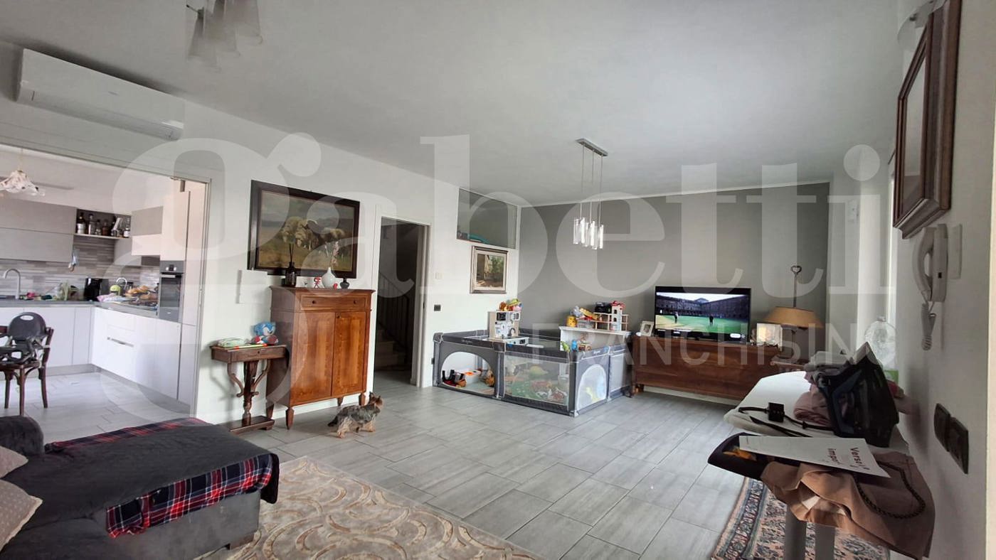 All'ingresso al pian terreno ci accoglie con grande luminosit l'ampia zona living, con cucina abitabile, separata da una porta scorrevole e troviamo anche un bagno al servizio della zona giorno.
