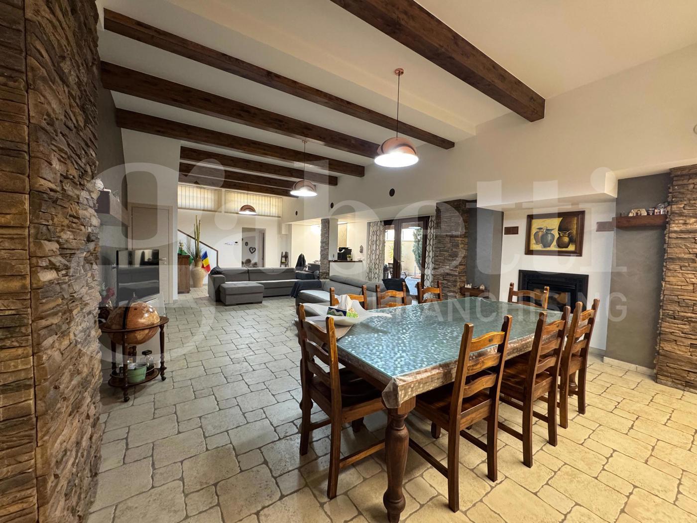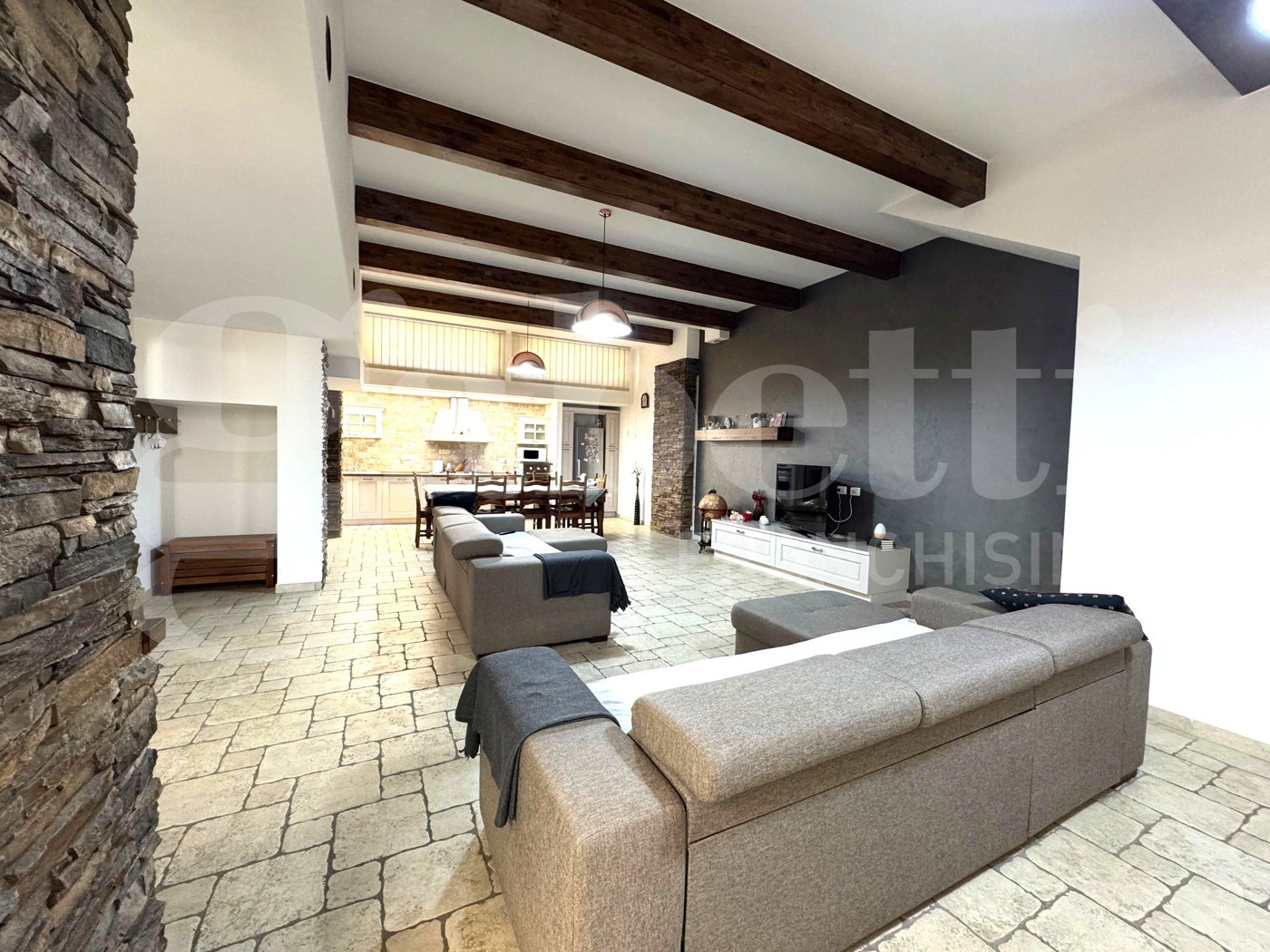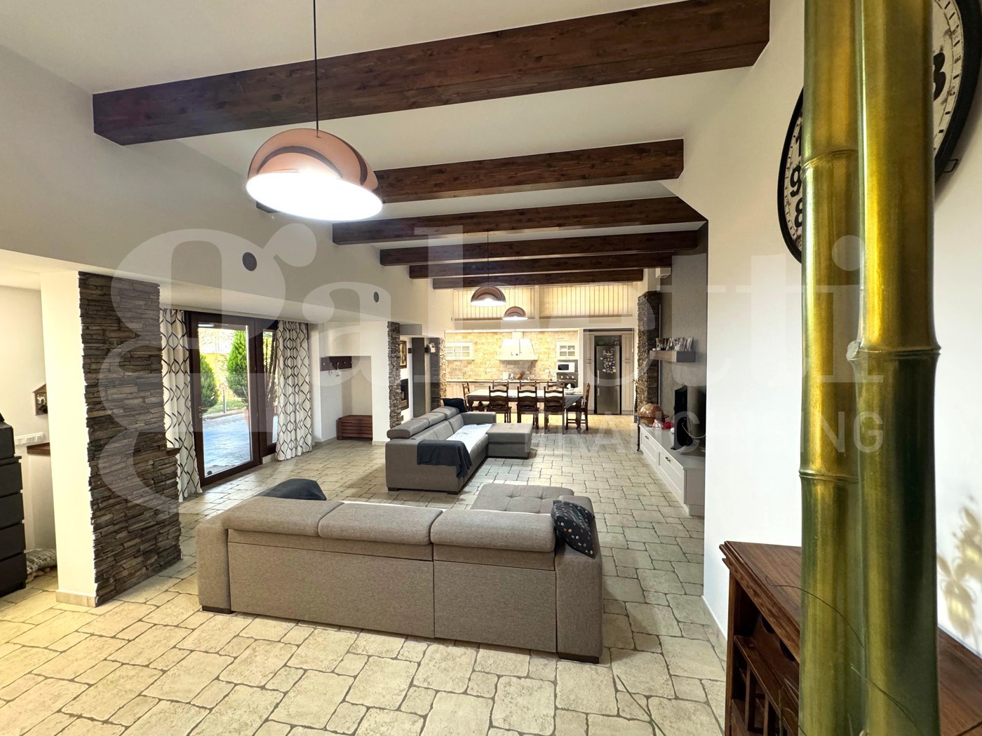 Al piano terra (seminterrato ma completamente sbancato) troviamo un ampio e curato salone openspace, ambiente caldo e accogliente impreziosito da una stufa a pellet con canna fumaria collegata al tetto, travi in legno a vista, pavimentazione in cotto e rivestimenti in pietra su alcune pareti che donano carattere e personalit agli spazi.