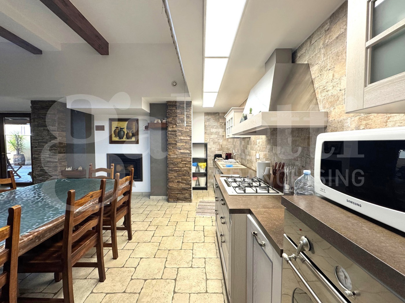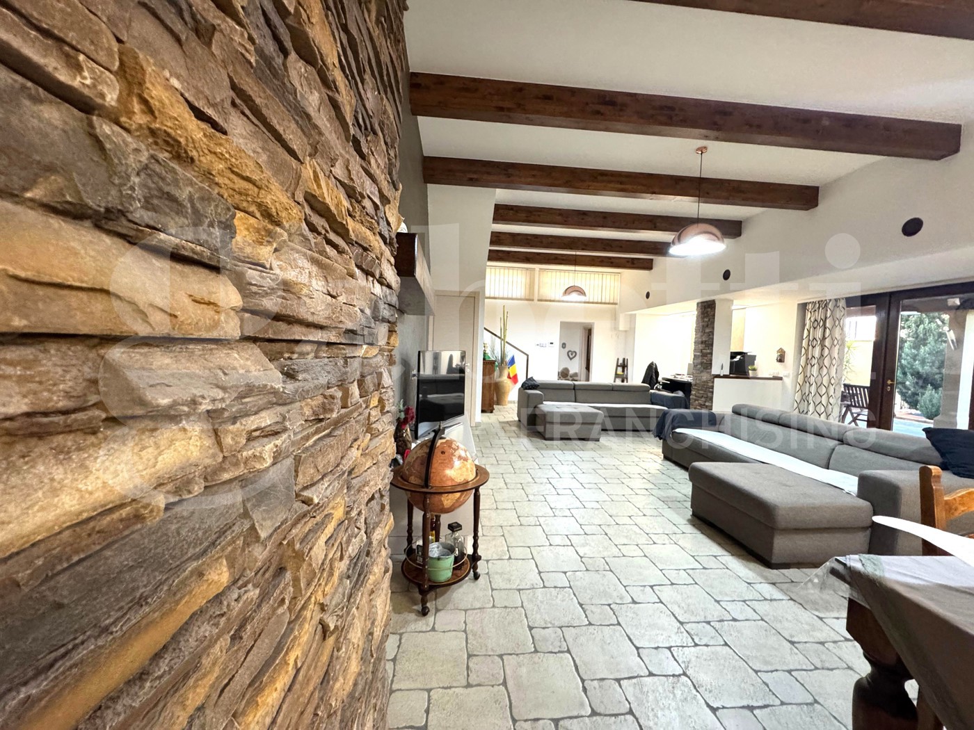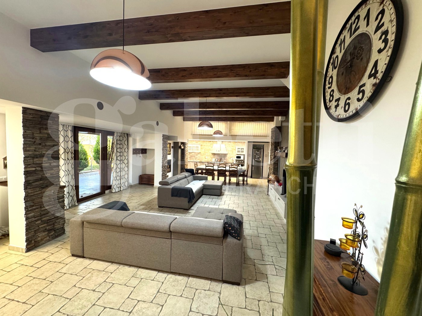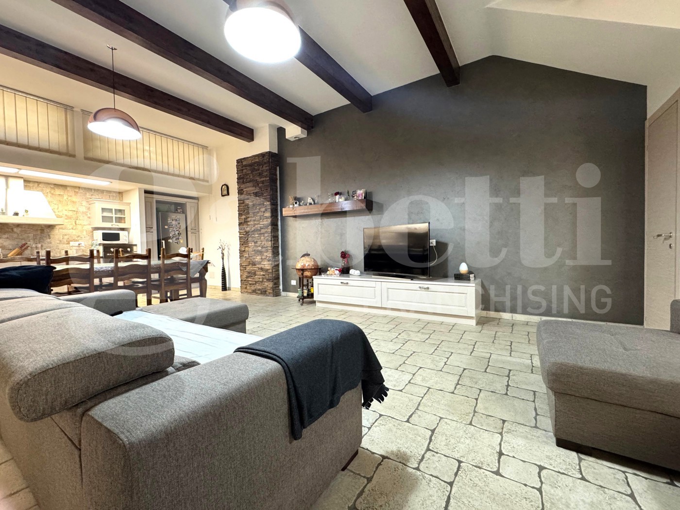 Al piano terra (seminterrato ma completamente sbancato) troviamo un ampio e curato salone openspace, ambiente caldo e accogliente impreziosito da una stufa a pellet con canna fumaria collegata al tetto, travi in legno a vista, pavimentazione in cotto e rivestimenti in pietra su alcune pareti che donano carattere e personalit agli spazi.