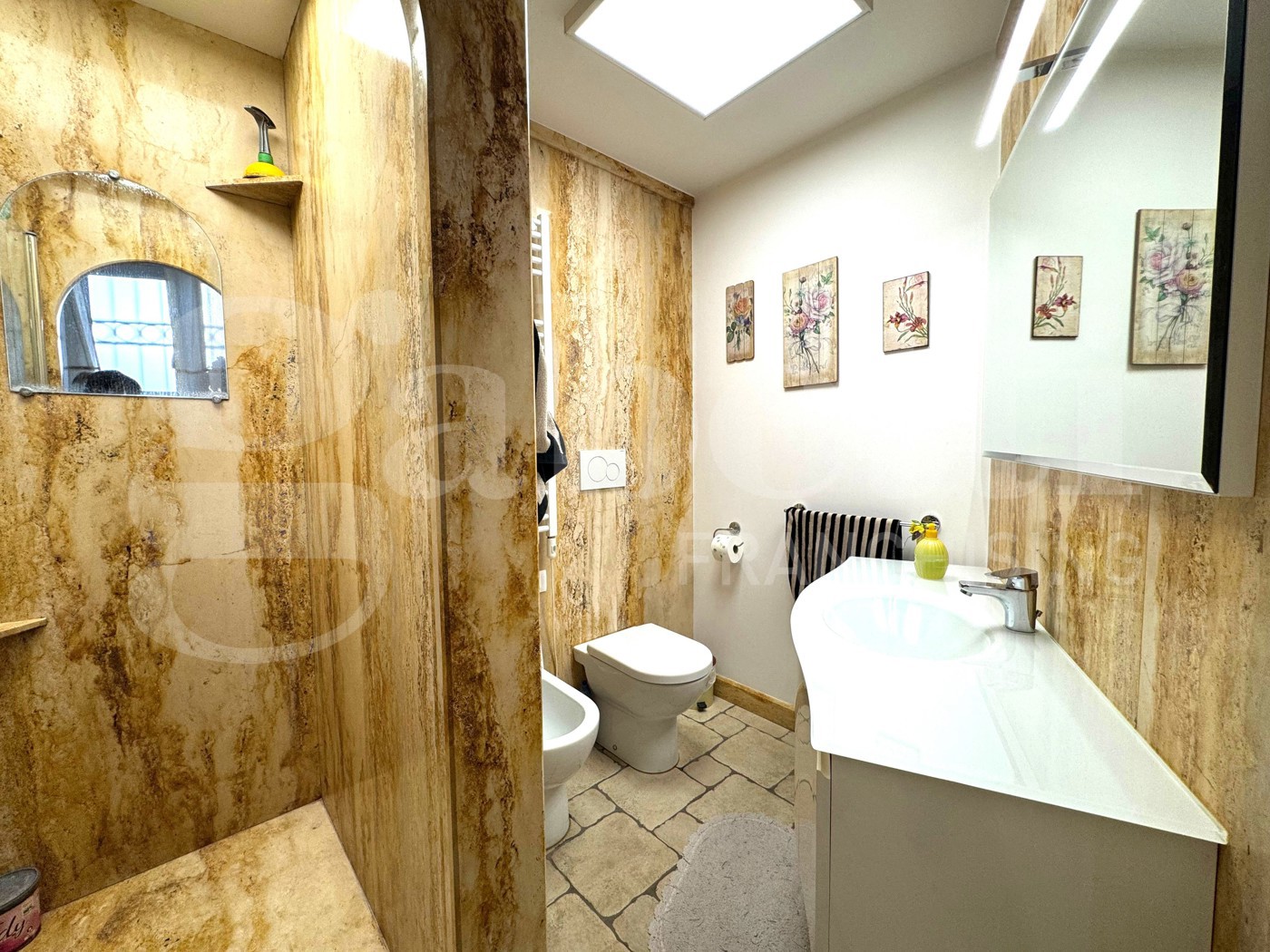 Completa il livello un elegante bagno con doccia in marmo.