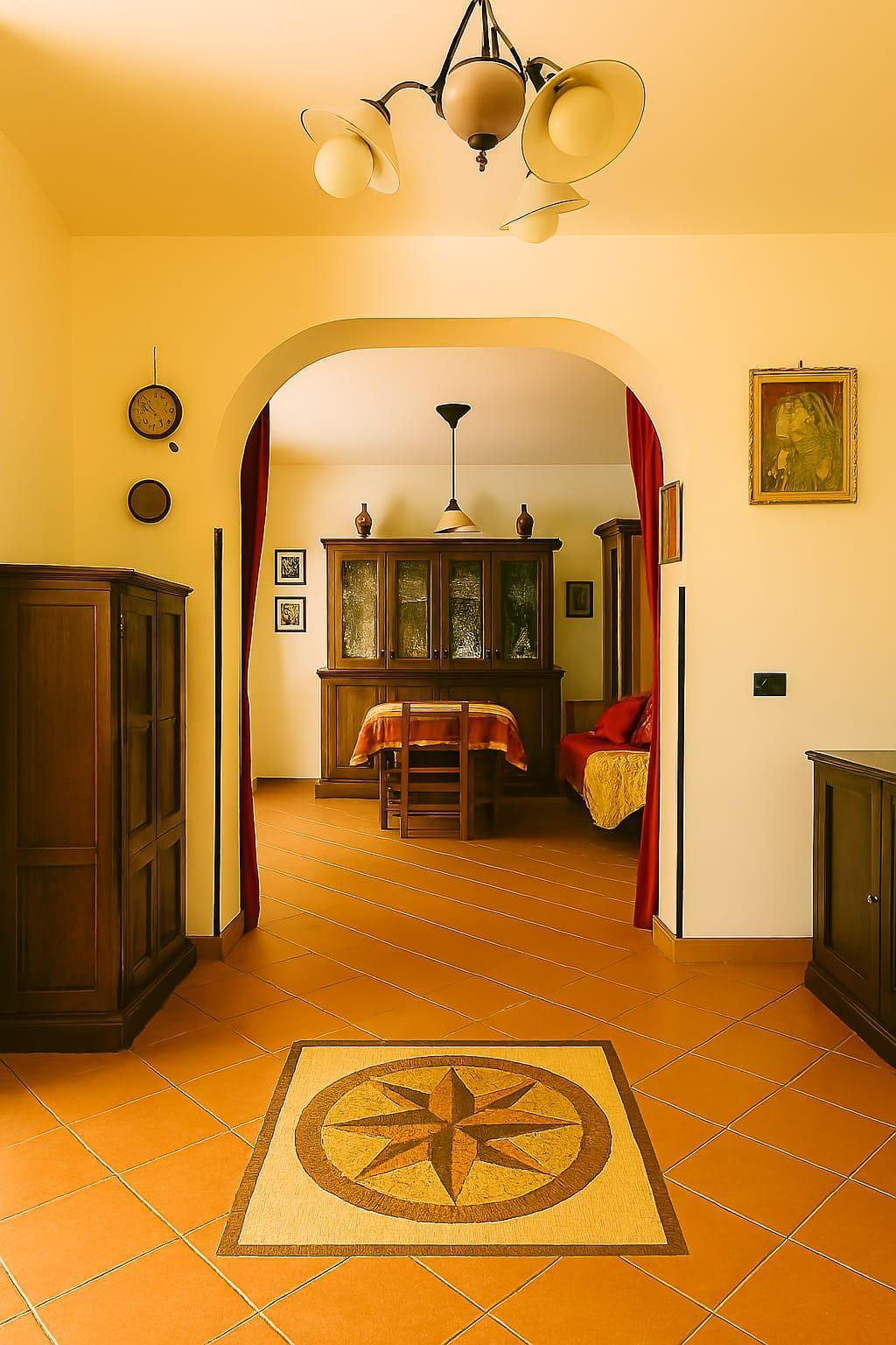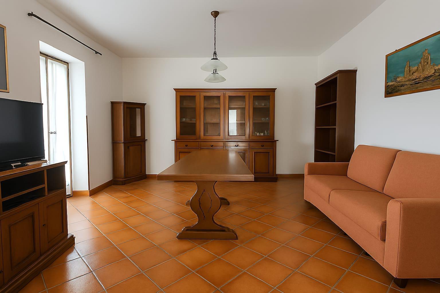 L'appartamento ha una superficie di 135 Mq ed è composto da soggiorno, tinello con camino e cucina in muratura, due camere da letto, una cameretta e doppi servizi.