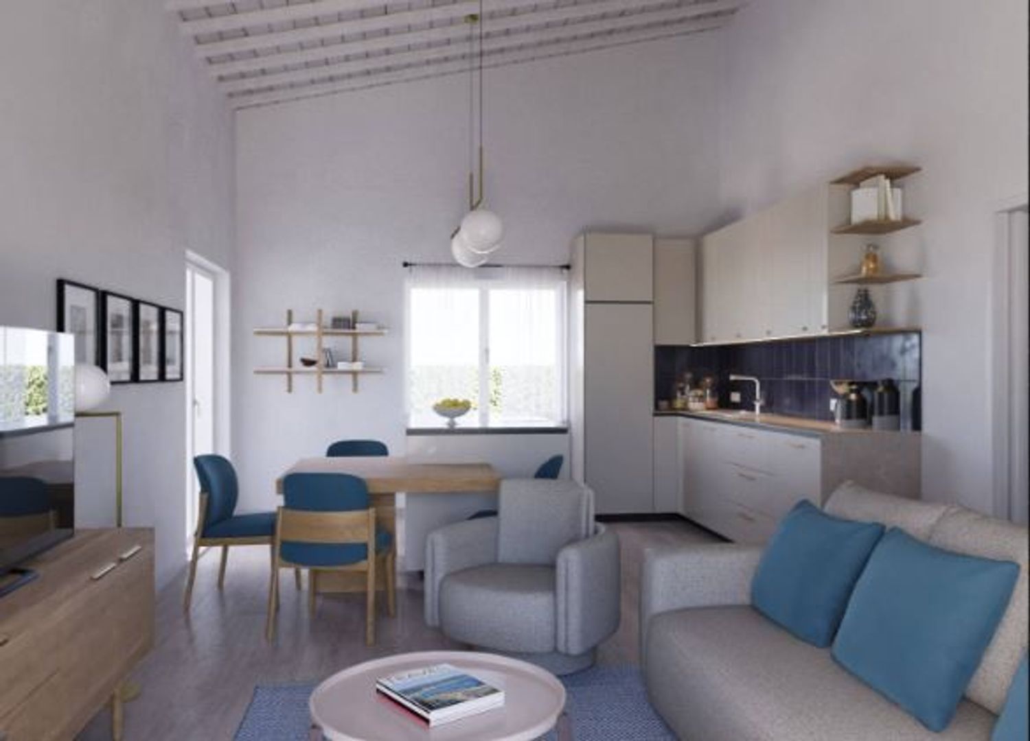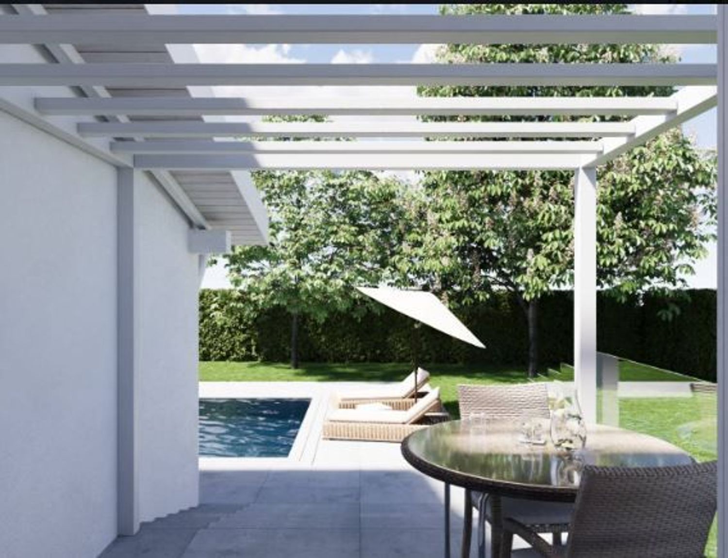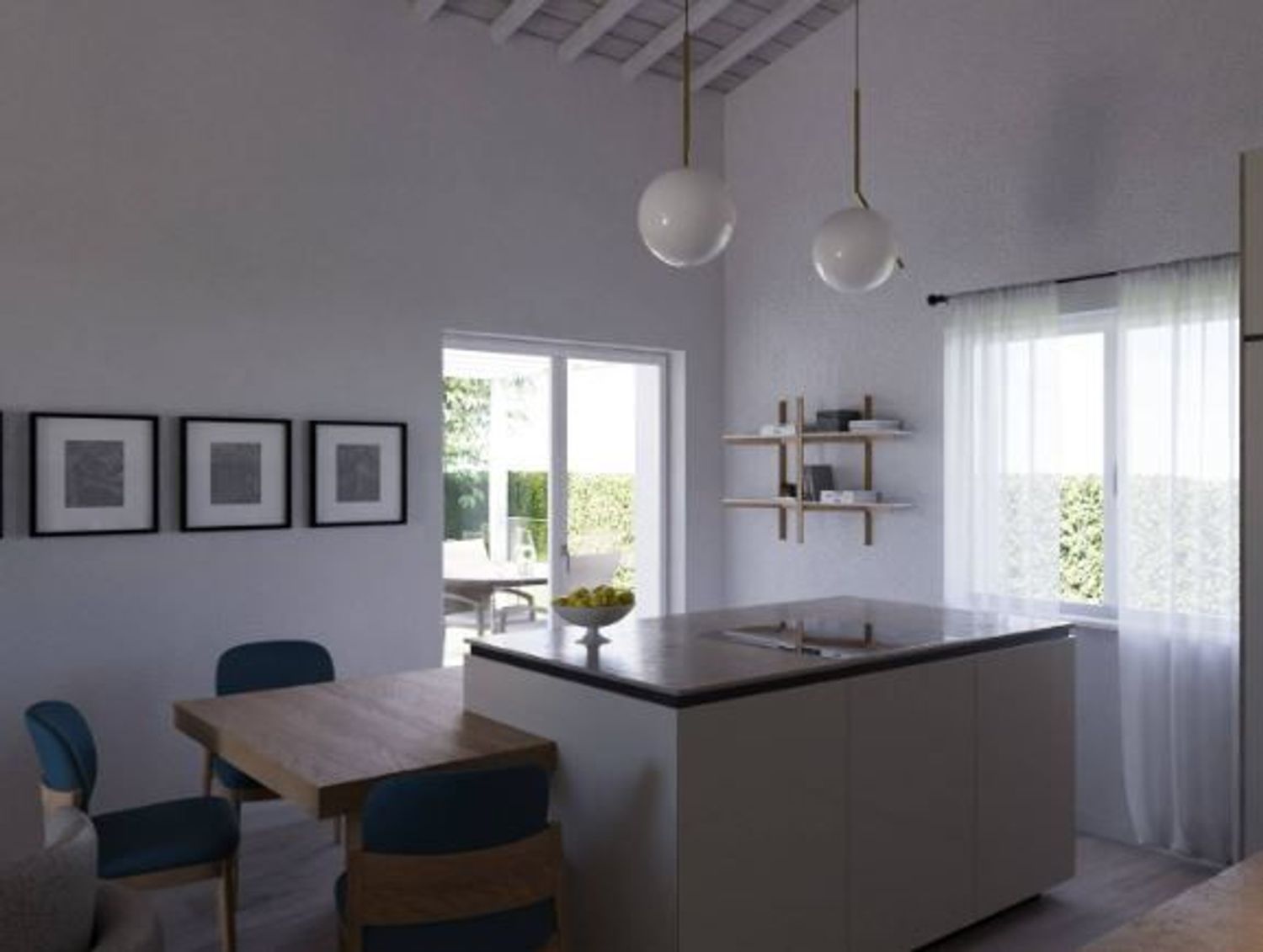 Il progetto prevede una costruzione su un unico livello composta da una grande zona giorno open space, due camere, due bagni e vano garage adiacente.