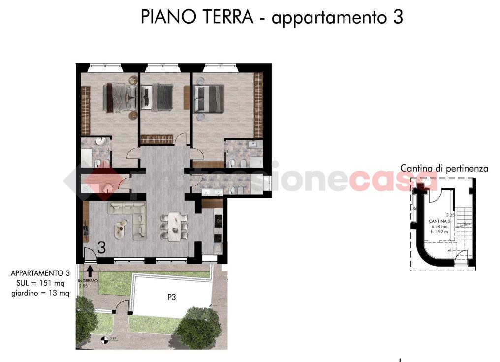 L'appartamento n.3 un ampio quadrilocale di 151mq circa, con 3 camere, un giardino esclusivo di circa 13 mq, cantina e posto auto. Soluzione ideale per la famiglia alla ricerca di spazi abbondanti in posizione strategica in una situazione super moderna.
