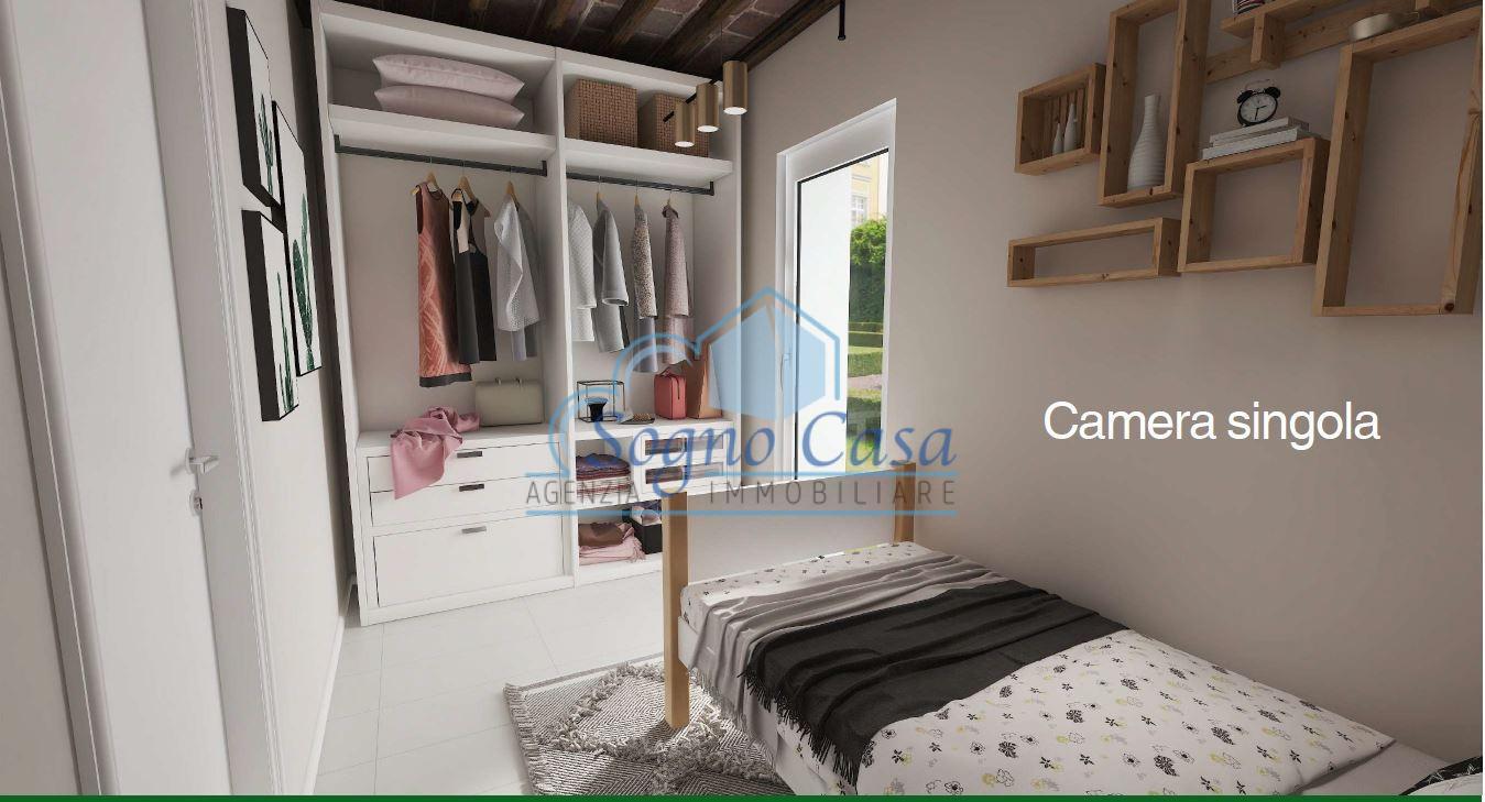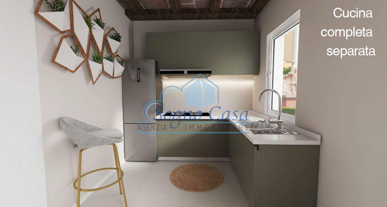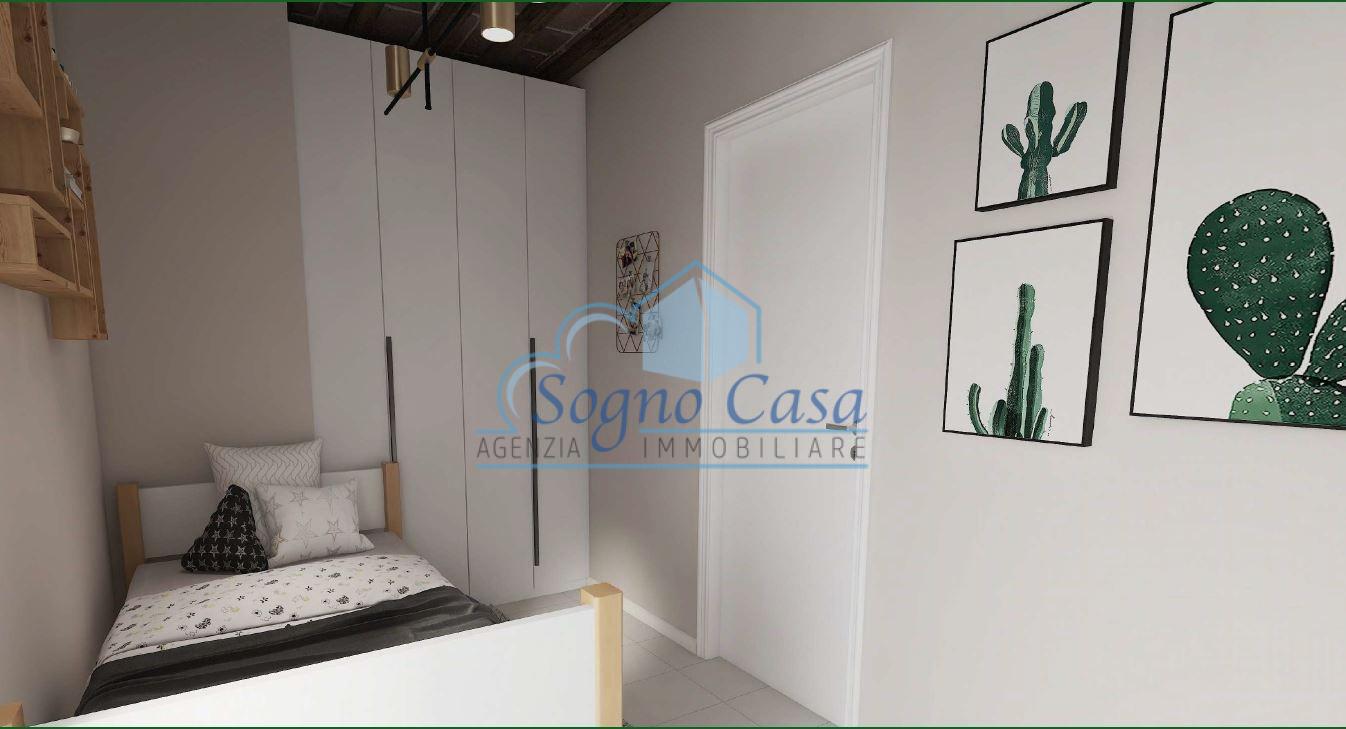 Distribuzione interna: luminoso soggiorno, cucina abitabile, camera matrimoniale, cameretta, bagno con doccia finestrato.