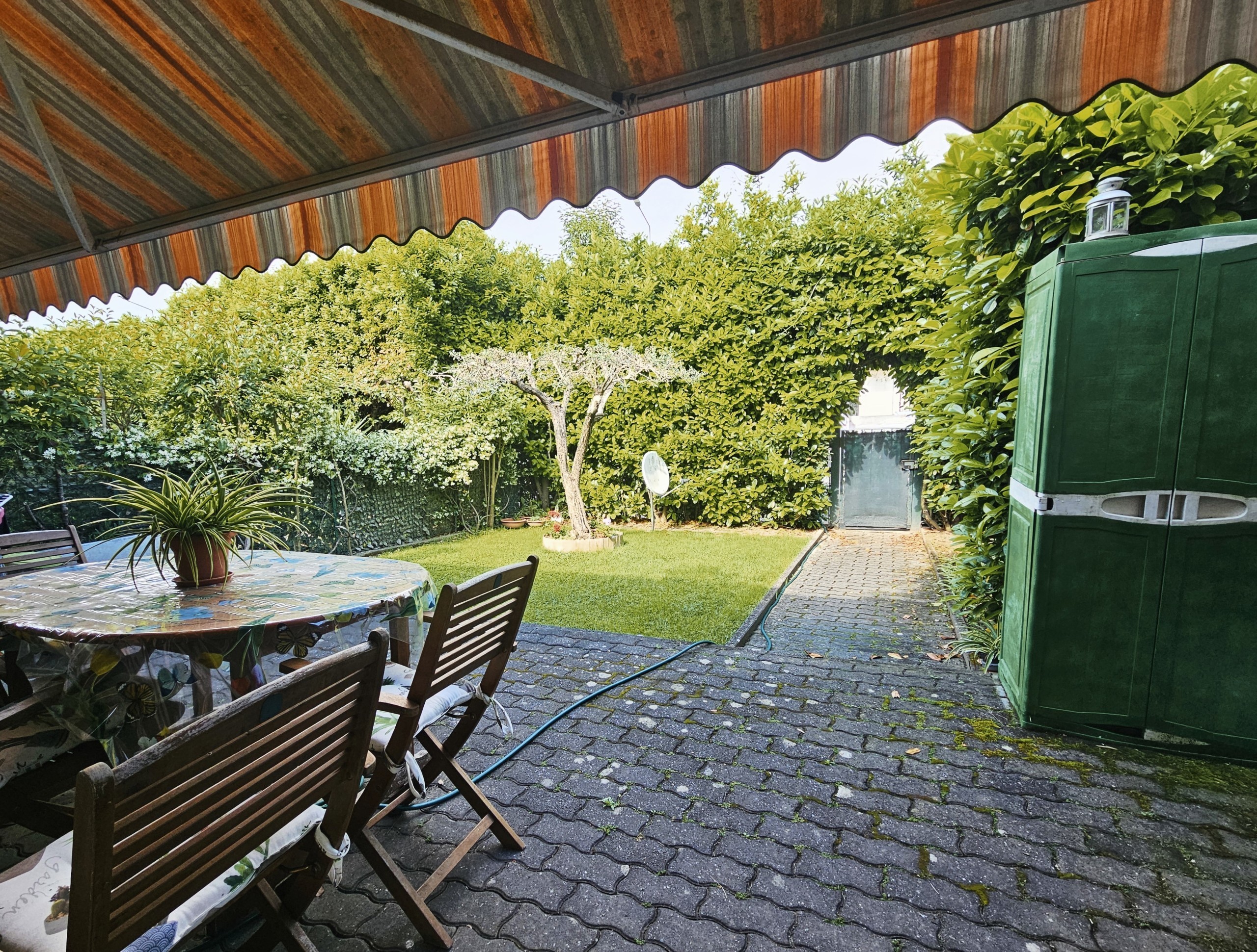 Al piano primo troviamo : soggiorno con angolo cottura arredato di cucina in marmo, giardino privato, con area pavimentata coperta da tenda elettrica, disimpegno zona notte, una camera matrimoniale, una camera singola ed il primo bagno finestrato con vasca.
