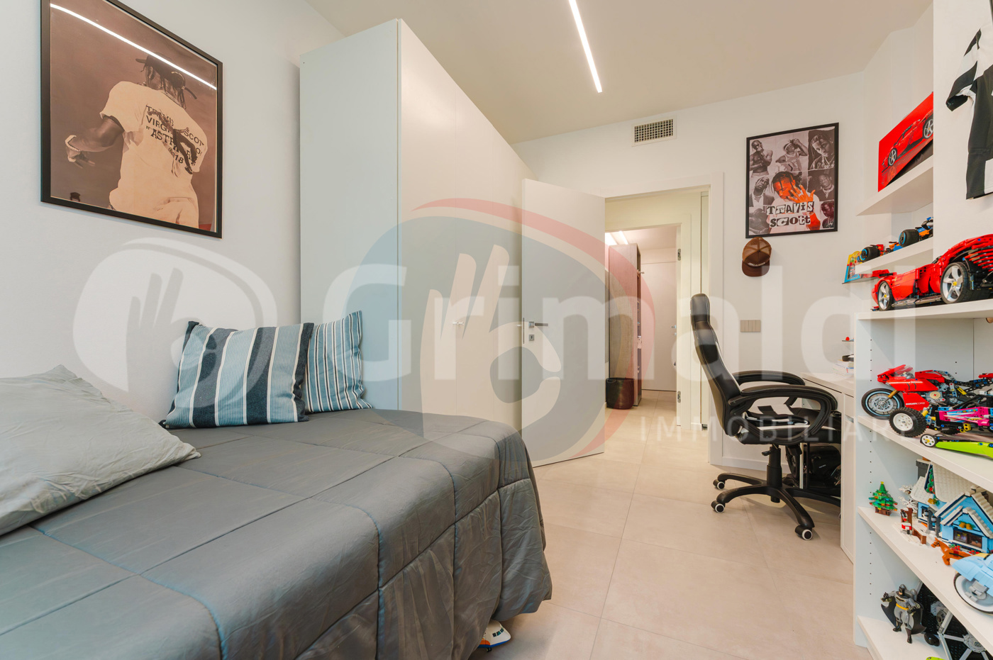 La cucina a vista si apre sul luminoso soggiorno living di circa 37 mq, creando un ambiente accogliente e conviviale, mentre le tre camere da letto (matrimoniale di 14,59 mq, doppia di 10,84 mq e 10,74 mq) offrono spazio e privacy.