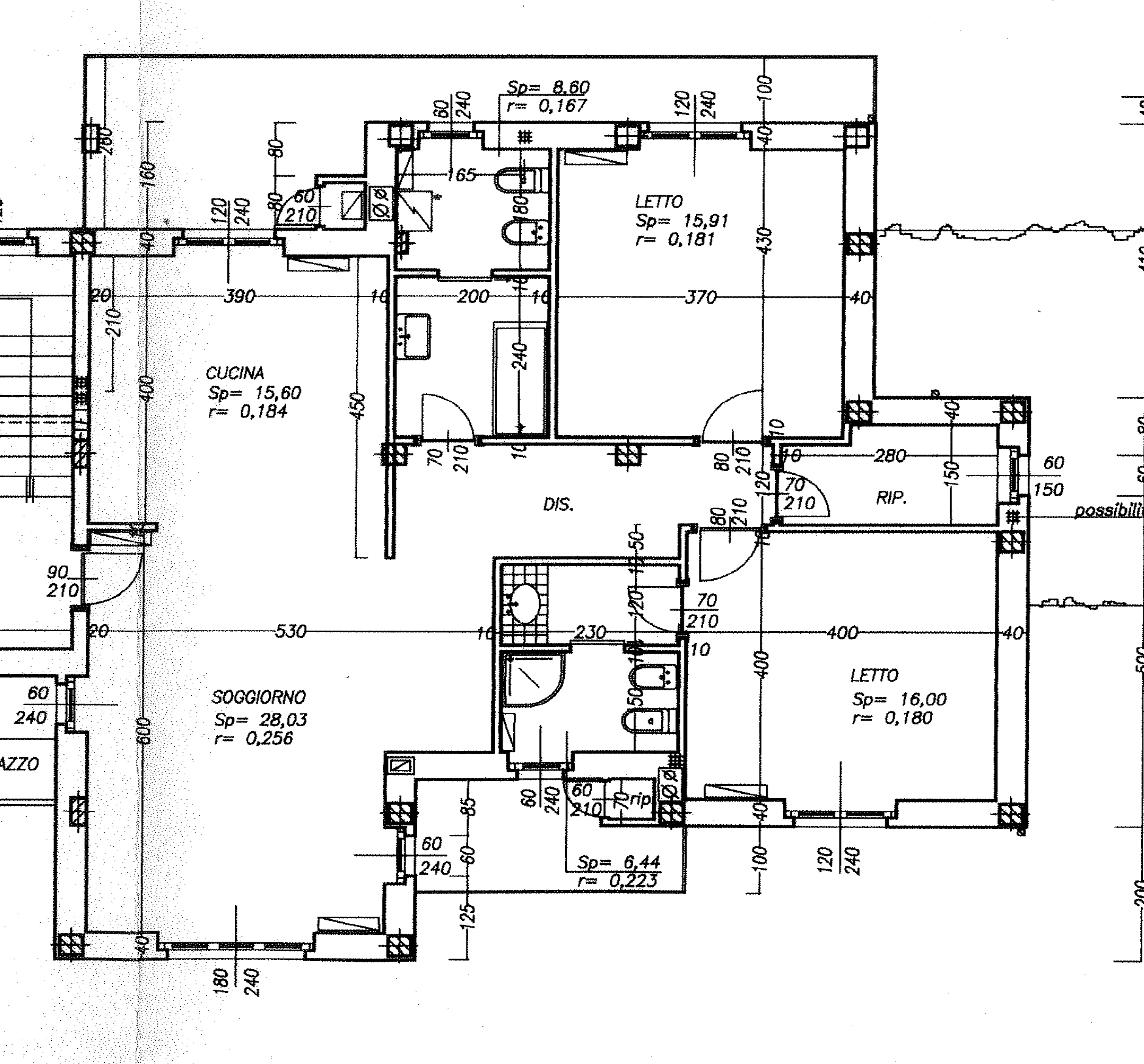 L'appartamento è un Grande QUADRILOCALE a piano primo, di circa 115 mq composto da ampio soggiorno con cucina, disimpegno, due ampie camere da letto, di cui una, la matrimoniale, con il bagno in camera, un secondo servizio accessibile da corridoio, grande rispoglio finestrato, due terrazzini e due balconi.