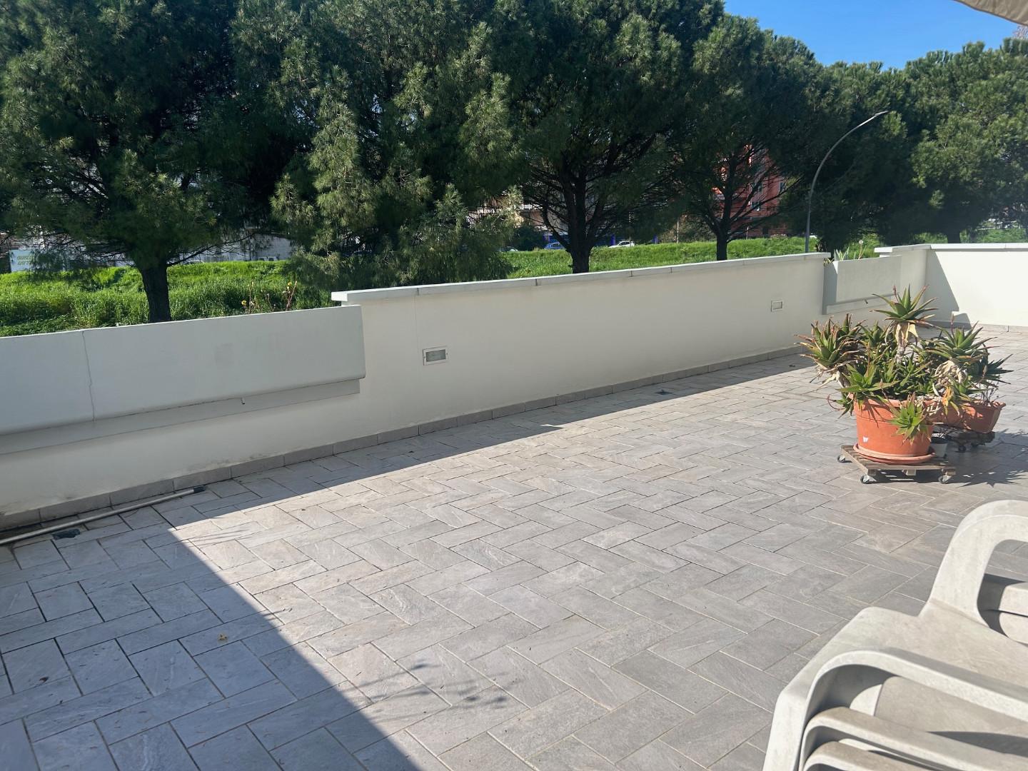 Tutte le stanze hanno accesso al grandissimo terrazzo di oltre mq. 70 che affaccia sul verde circostante, con alberi ad alto fusto.