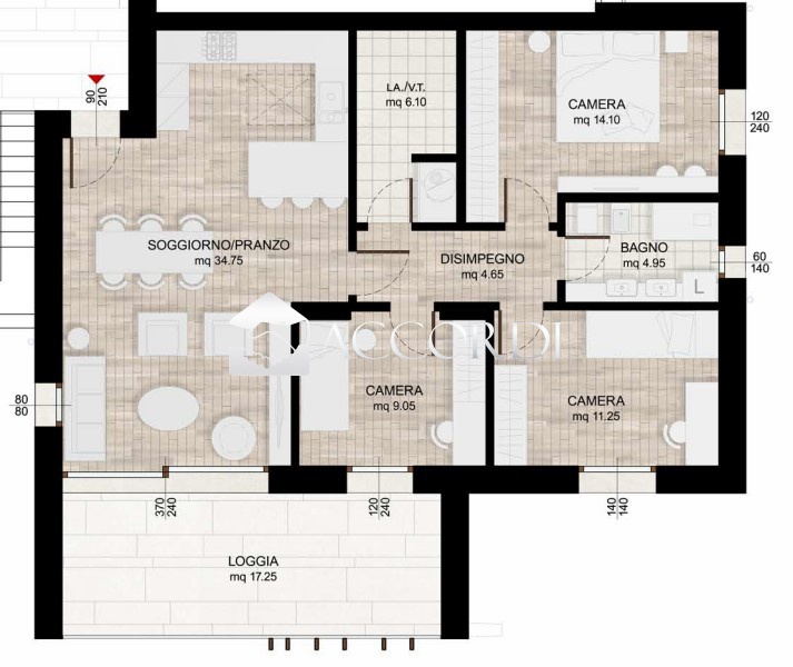 L'unità risulta così composta: ingresso su luminosa zona giorno open space di circa 35 mq con accesso diretto alla loggia coperta, disimpegno, tre comode camere (matrimoniale, doppia e singola), un bagno finestrato e un locale lavanderia.