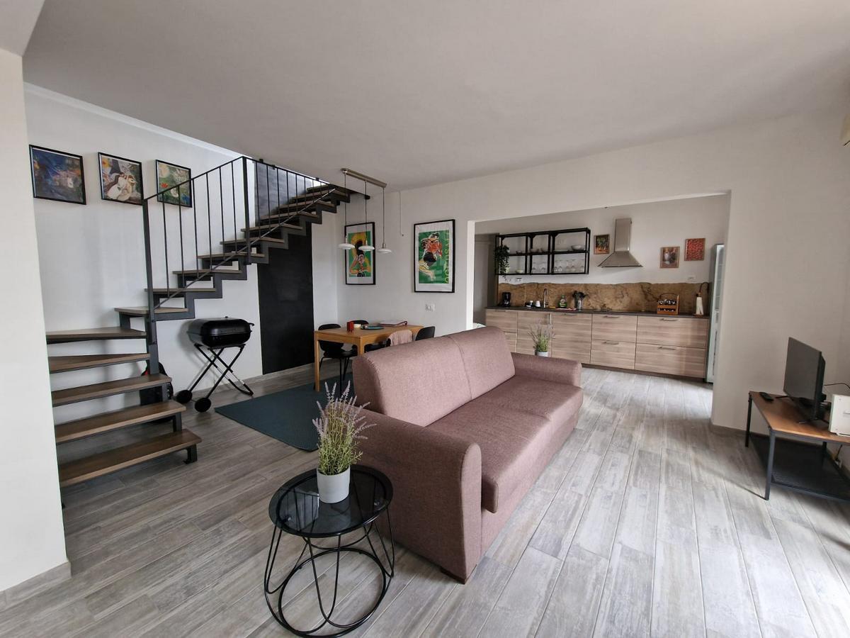 L'appartamento (65mq calpestabili) si trova al secondo ed ultimo piano in una palazzina posizionata nel centro storico del bellissimo borgo ed è così composto: ingresso nel soggiorno con angolo cottura e accesso al balcone panoramico, bagno con doccia e lavatrice, una grande camera matrimoniale, un ripostiglio, e dal soggiorno, una comoda scala conduce al secondo ripostiglio (20mq sottotetto) ed al terrazzo di 47 mq da dove si può ammirare i tetti del borgo e la splendida campagna che lo circonda.