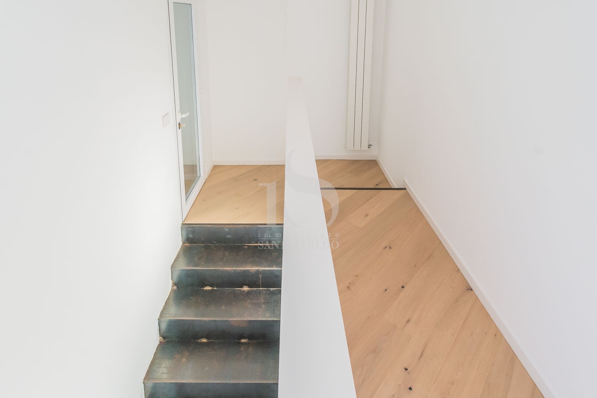 La scala su misura, integrata architettonicamente e dotata di illuminazione segna passo incassata, conduce alla zona notte.