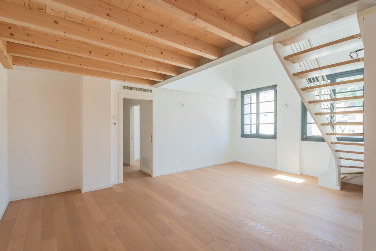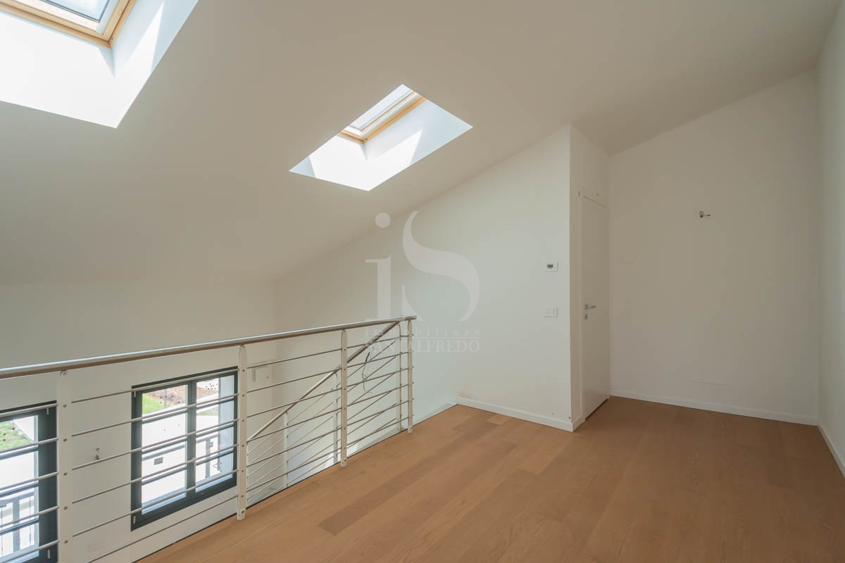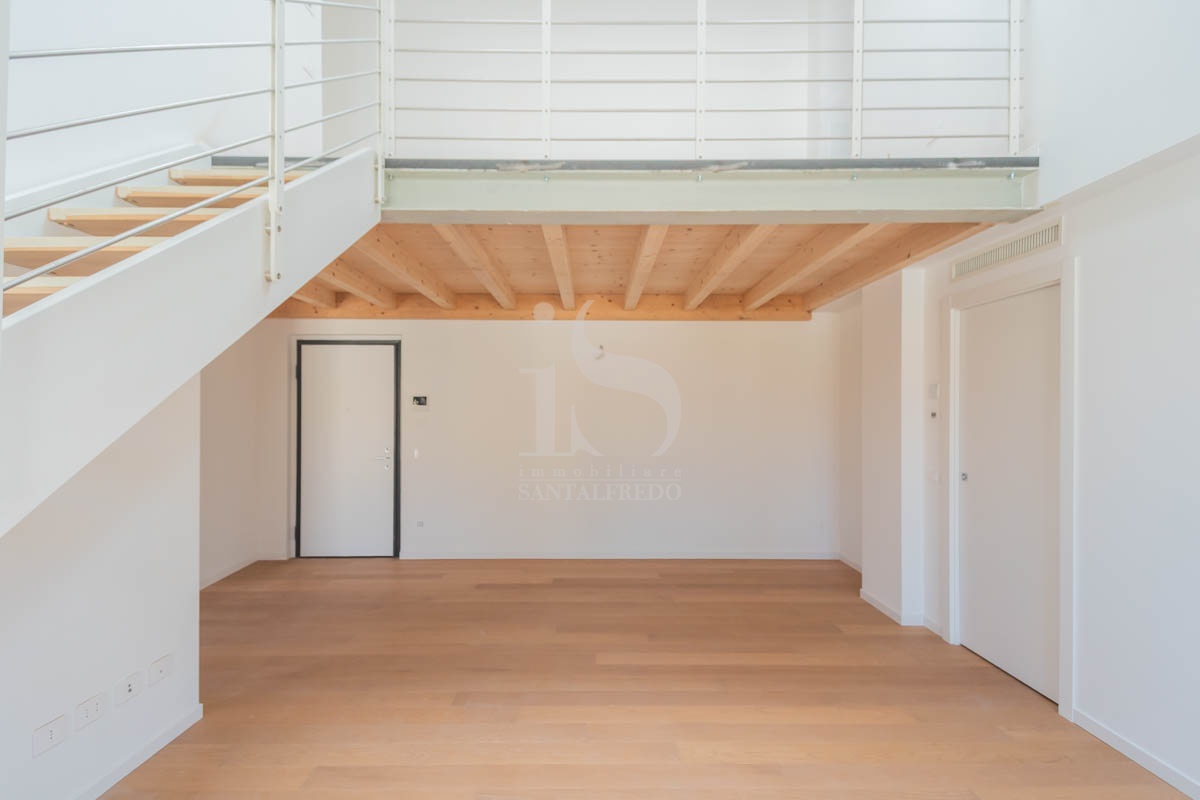 L'appartamento si distingue per la luminosa zona giorno con doppie vetrate e suggestiva altezza aperta sul piano superiore, che dona ampiezza e continuità agli spazi.
