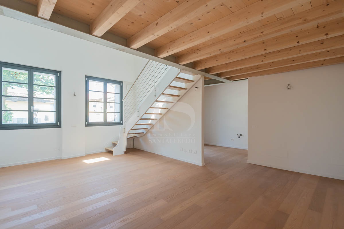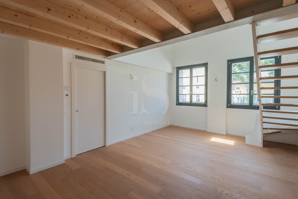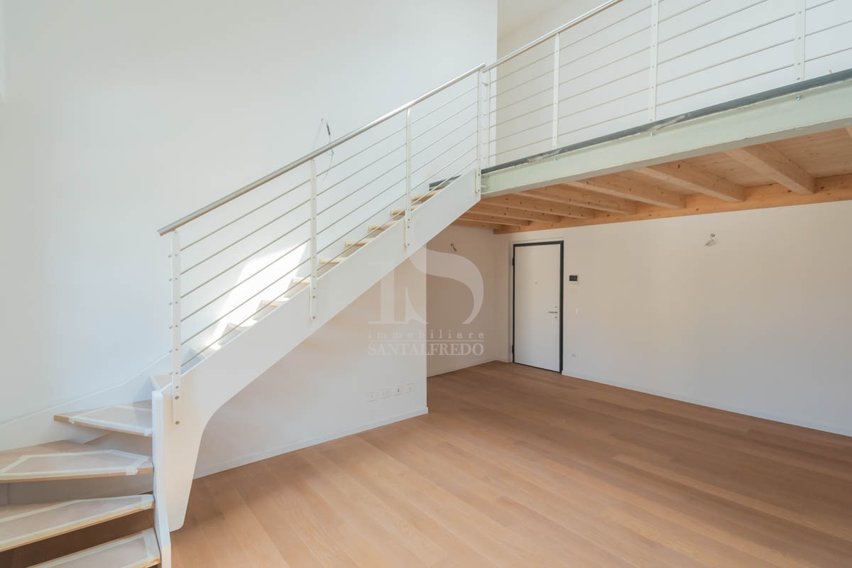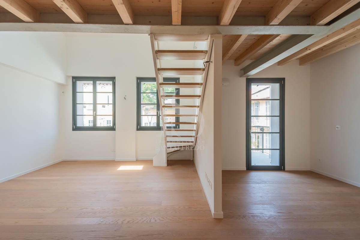L'appartamento si distingue per la luminosa zona giorno con doppie vetrate e suggestiva altezza aperta sul piano superiore, che dona ampiezza e continuità agli spazi.
