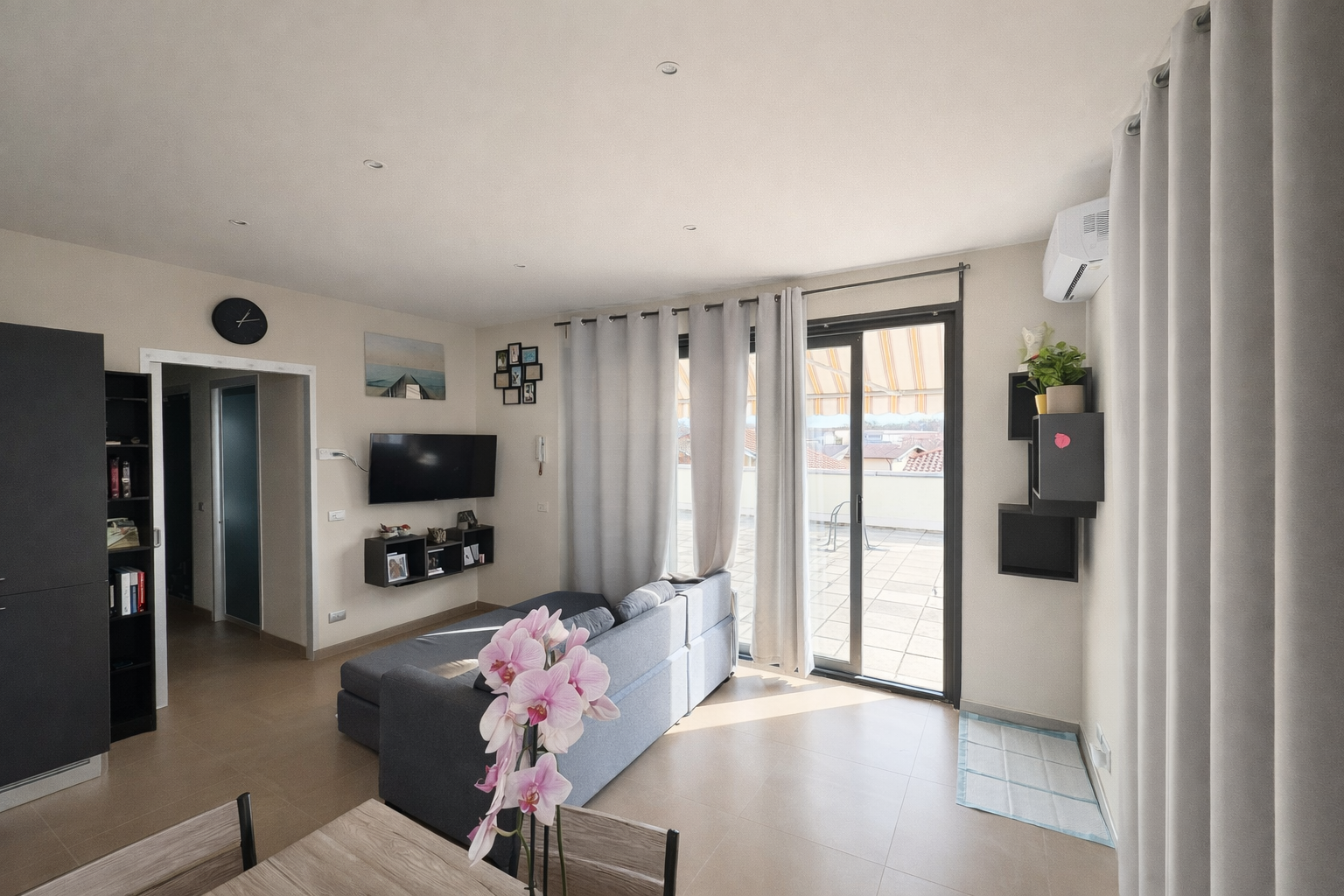 Lappartamento si compone di ampia zona giorno con cucina a vista, molto luminosa e con accesso diretto a uno splendido terrazzo di circa 70 mq, ideale per pranzi allaperto, momenti di relax e per vivere pienamente lo spazio esterno.